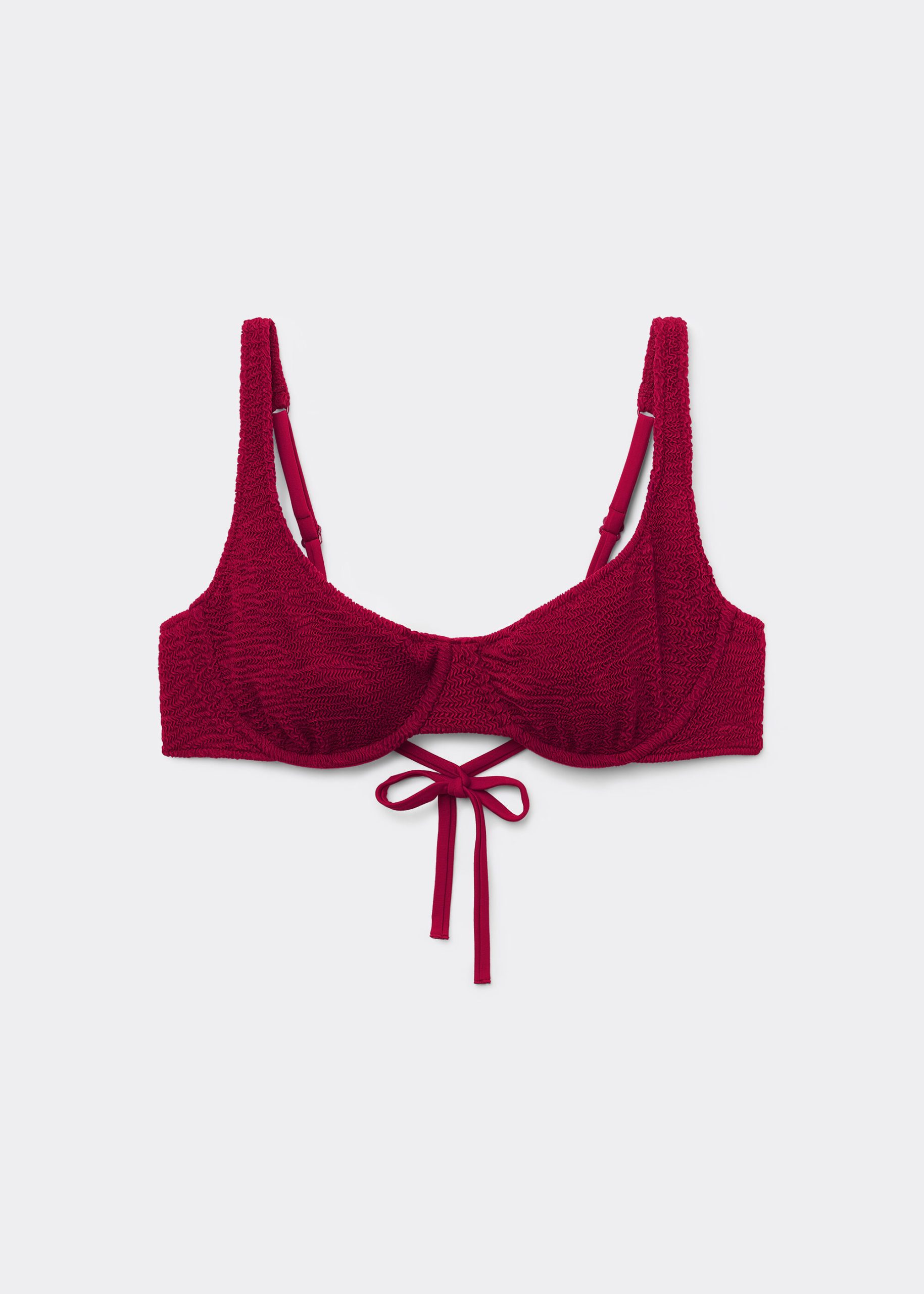 Unpadded balconette bikini top with underwire. The structure of the cups perfectly embraces and supports the bust, while the side drawstring can adjust the fit. Ideal for larger busts. The style features a crinkle fabric with a three-dimensional effect. Adjustable straps and thin tie closure on the back.