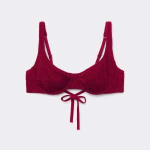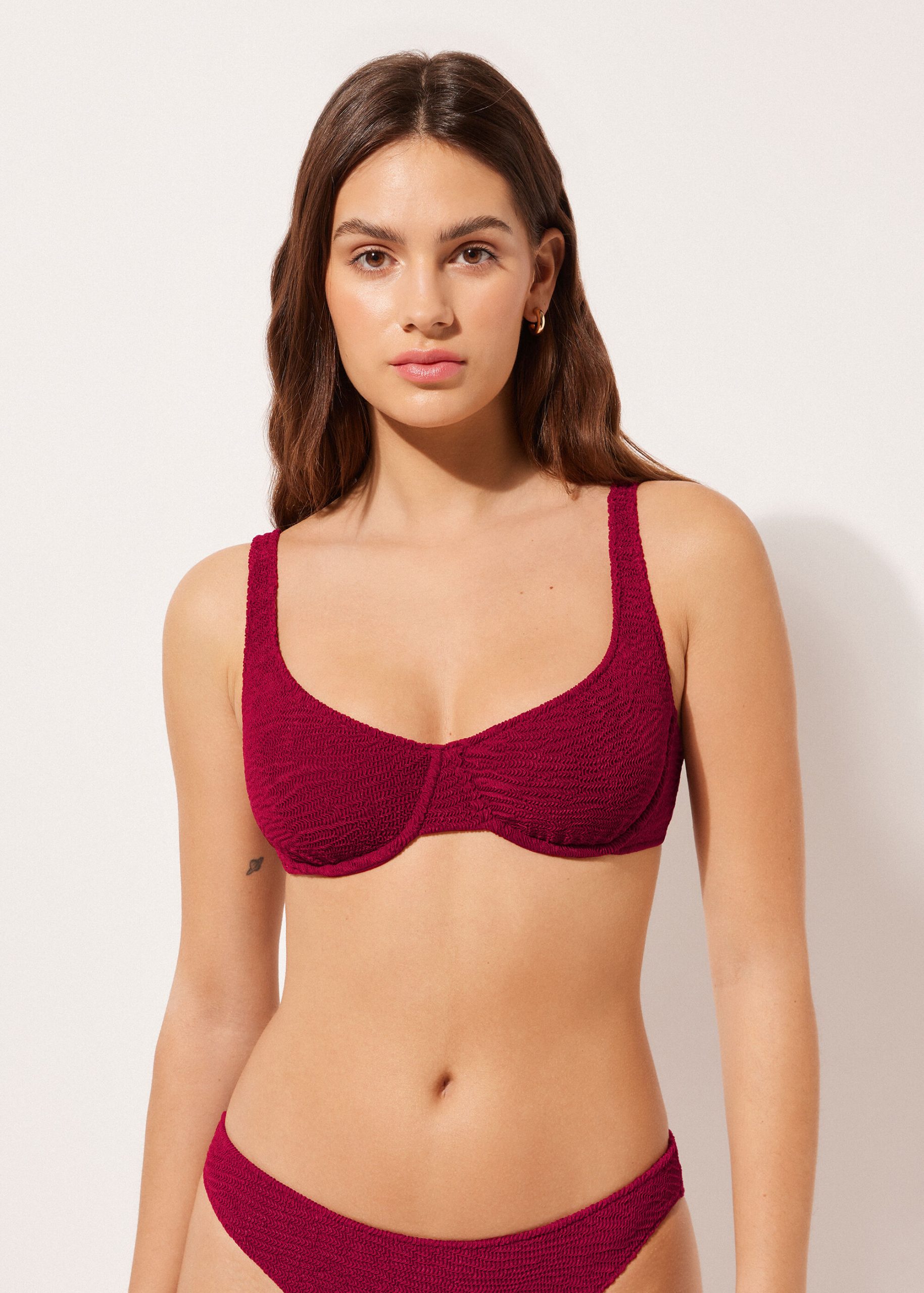 Unpadded balconette bikini top with underwire. The structure of the cups perfectly embraces and supports the bust, while the side drawstring can adjust the fit. Ideal for larger busts. The style features a crinkle fabric with a three-dimensional effect. Adjustable straps and thin tie closure on the back.