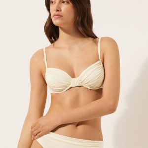 Unpadded balconette bikini top with underwire. The structure of the cups perfectly embrace and support the bust, thanks to the side drawstring on the cups that can also adjust the fit. Ideal for the larger bust. The style features a bright fabric with a silky effect, embellished by ruffles and gold tips. Adjustable straps and hook closure with two adjusters.