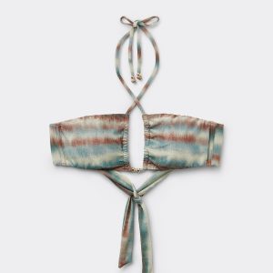 Bandeau bikini top with no padding or underwire boasting a versatile and minimalist design. The front crossing of strings, which can be tied in different ways, give a touch of originality and refinement. The string fastening on the back guarantees an adjustable fit, perfect for an absolutely personalized summer look.