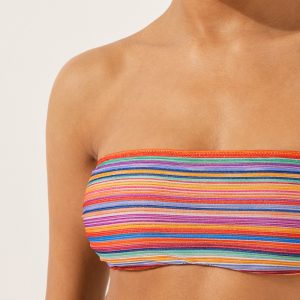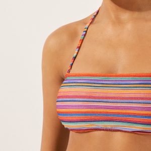 Lightly padded straight-cut bandeau bikini top, wireless for a natural effect. The side boning helps support the bust. Striped patterned fabric in bright colors enhanced with sparkling glitter, creating a dynamic and contemporary effect with its soft texture and vibrant look. Removable shoulder strap. Back tie closure.