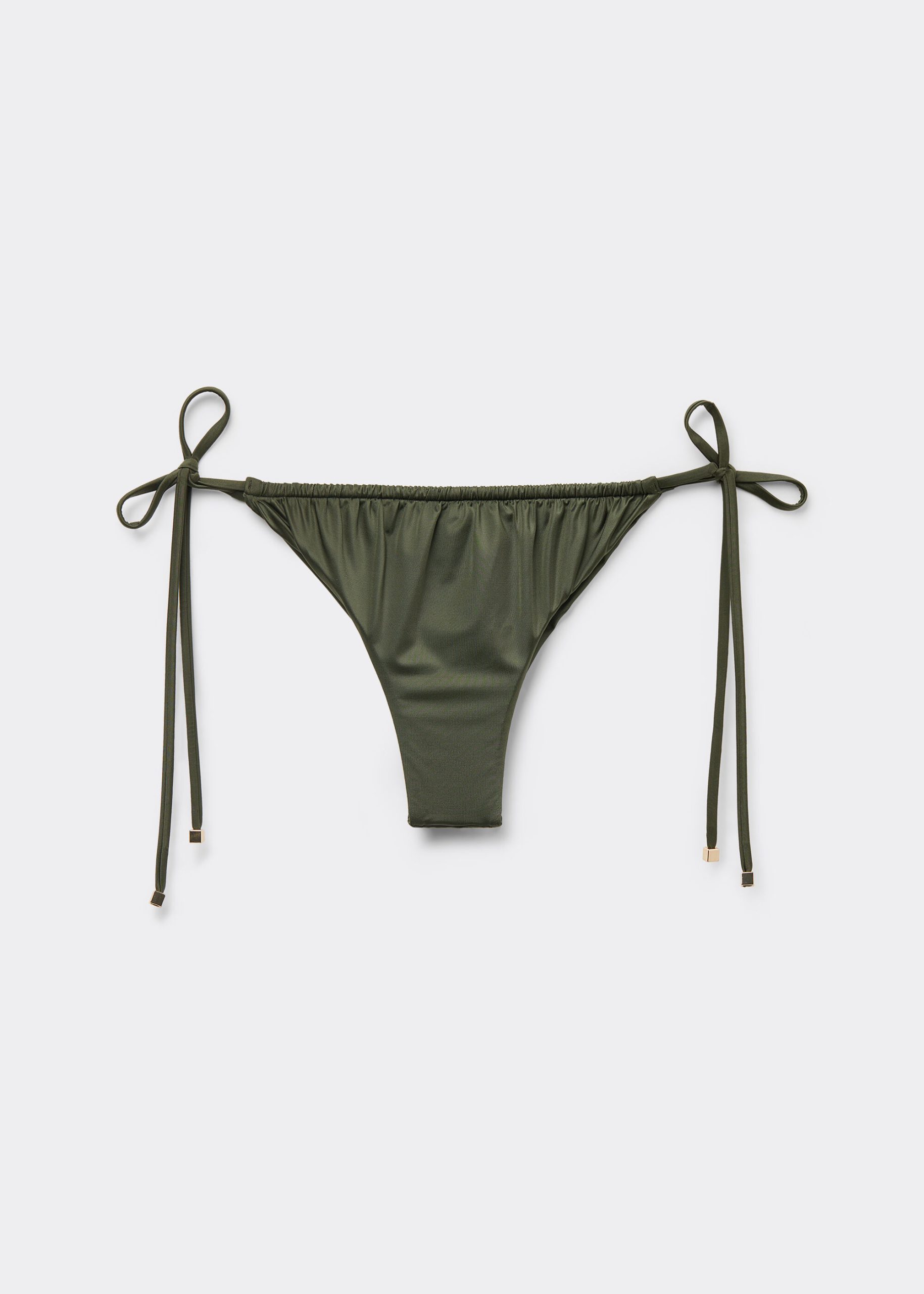 Brazilian cut bikini bottom with side ties to adjust the fit. The style features a bright fabric with a silky effect, embellished by ruffles and gold tips. Fully lined with invisible seams.