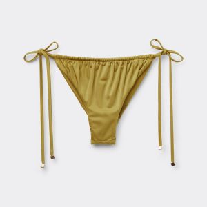 Brazilian cut bikini bottom with side ties to adjust the fit. The style features a bright fabric with a silky effect, embellished by ruffles and gold tips. Fully lined with invisible seams.