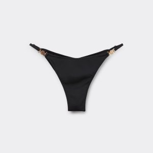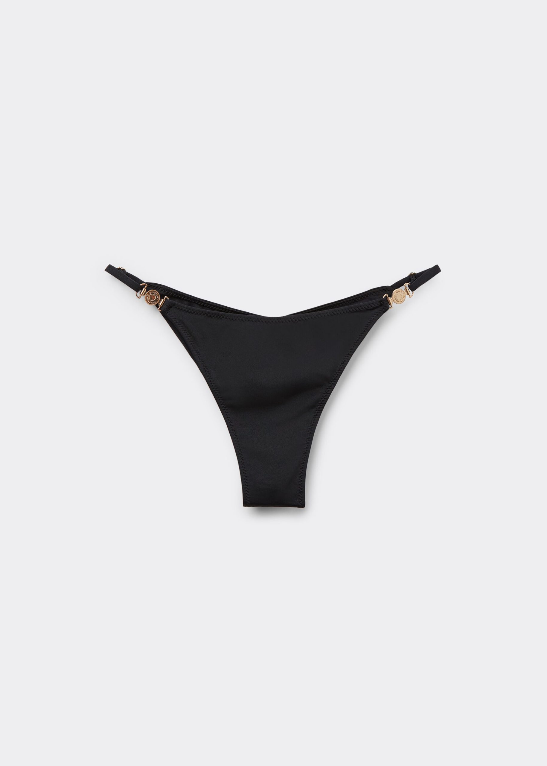 Brazilian bikini bottoms with adjustable side panels, featuring a minimal fit that exalts the silhouette with a touch of sensuality and refinement. The slightly rounded waist at the front allows for both a regular and more high-cut fit, depending on one’s physique. The bright silk-effect fabric embellished by elegant golden details radiates a sophisticated sensation of discrete luxury. Fully lined with invisible seams.
