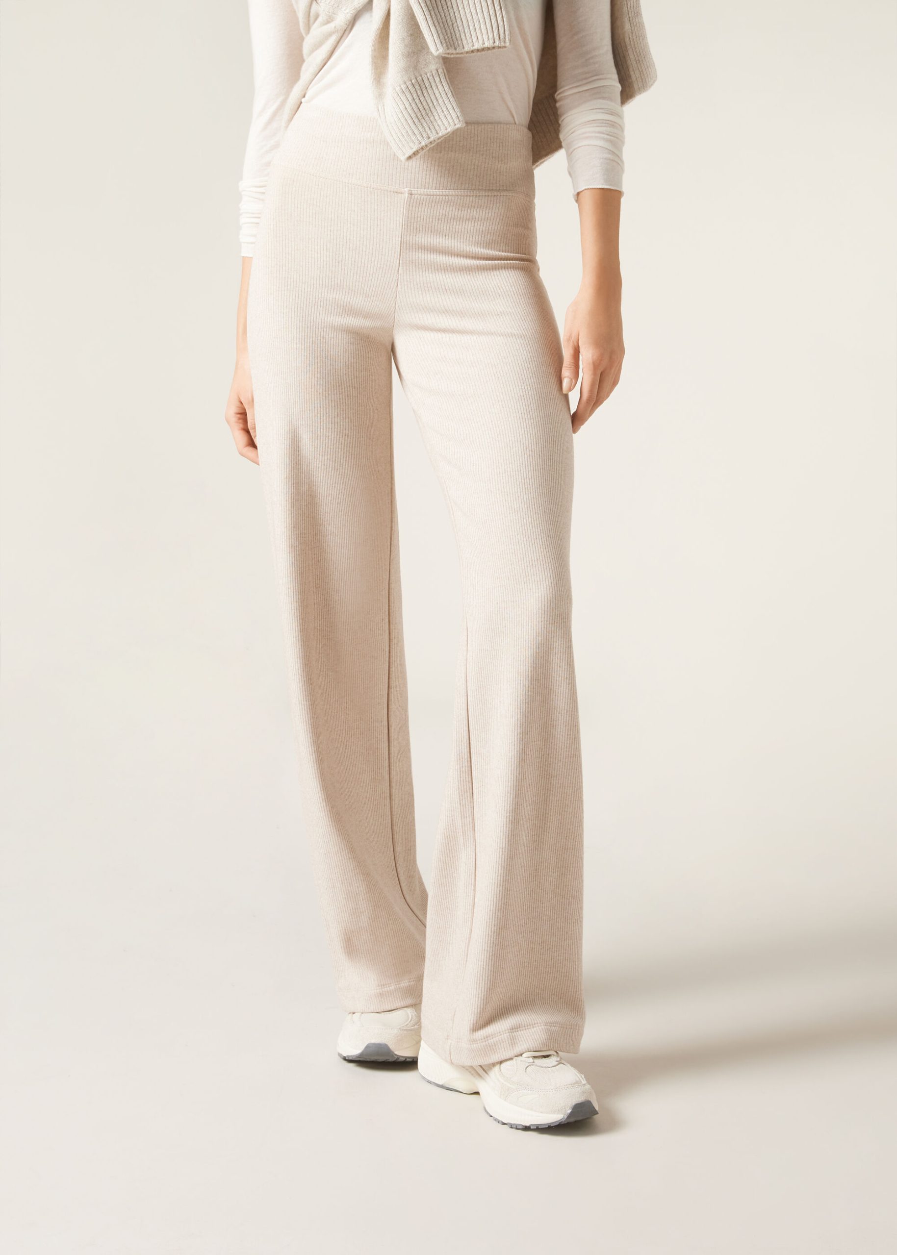 Women’s ribbed cashmere blend modal palazzo pants featuring a comfortable, elastic-free high waist. The fabric is opaque, soft, and breathable, with a brushed interior for a warm and comfortable effect, perfect to combine style and comfort on the coldest days.