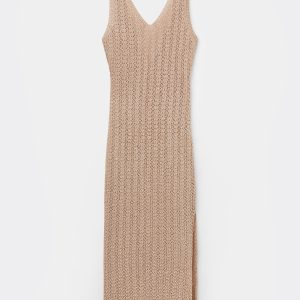 Maxi dress crocheted in refined golden lamè, featuring and elegant V neckline on both the front and back. The sophisticated side slits provide movement and lightness, exalting the silhouette. Perfect for sophisticated and versatile looks, ideal to wear on top of beachwear or for special chic appeal occasions.
