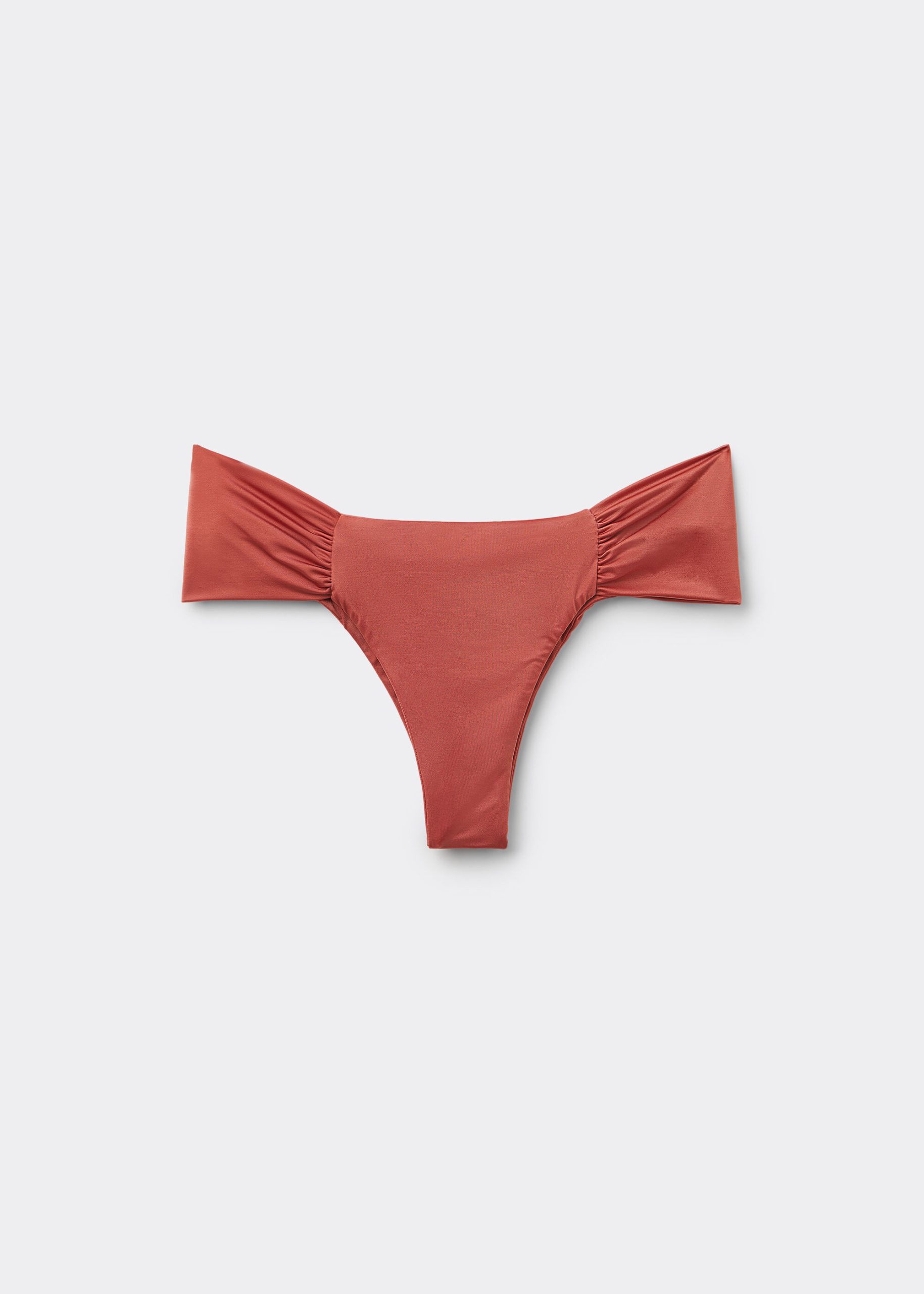 Brazilian bikini bottom with draped fabric at the sides that allow the height to be adjusted. The style features a particularly soft, shiny, silky-effect fabric. Fully lined and with invisible seams.