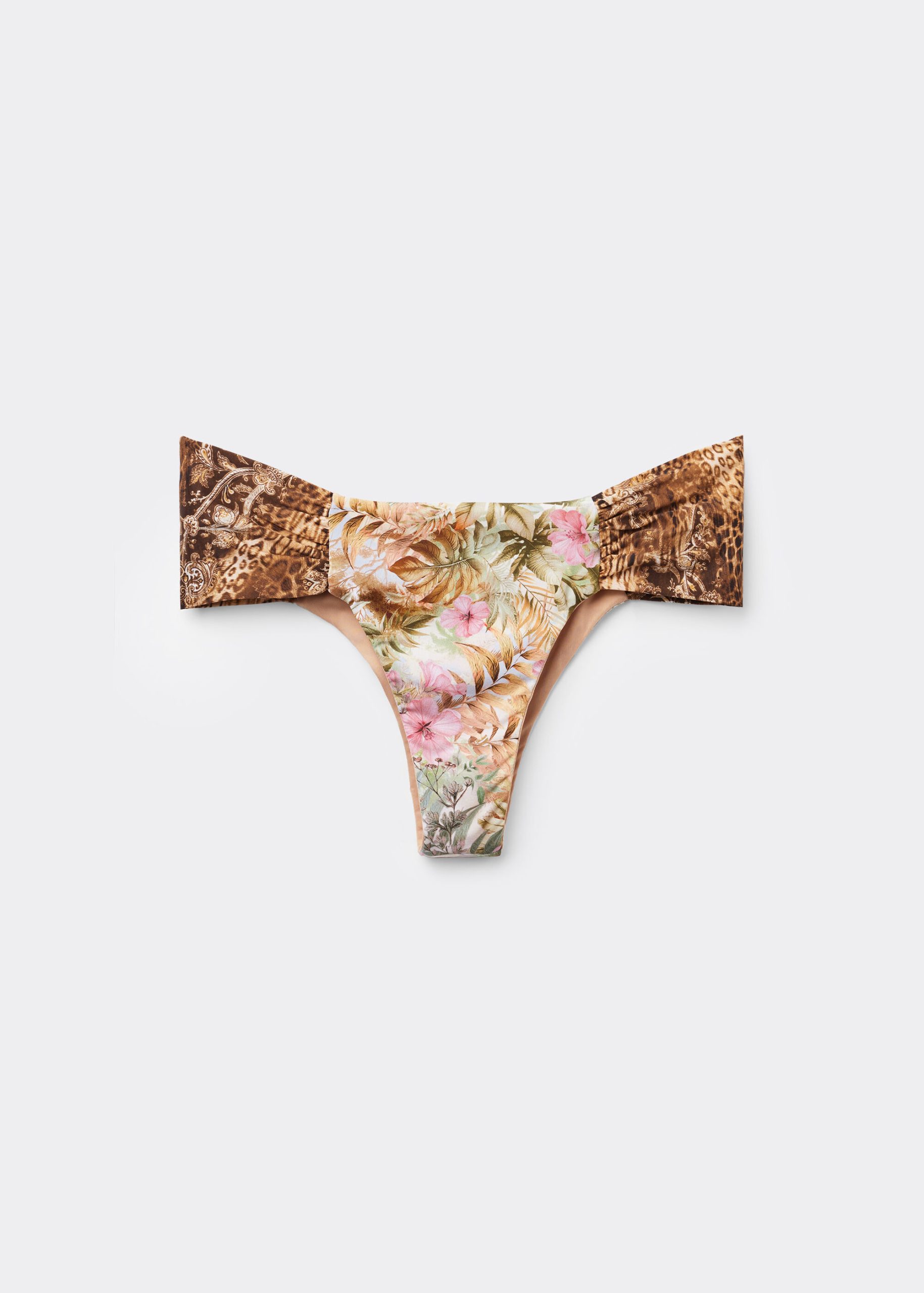 Brazilian bikini bottoms with draped fabric at the sides that allow the height to be adjusted. A vibrant pattern that combines tropical floral prints and delicate colors with animal print details. Fully lined and with invisible seams.