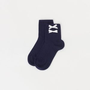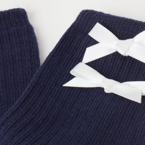 Girls’ short soft cotton socks featuring a ribbed construction and an elegant bow appliqué.