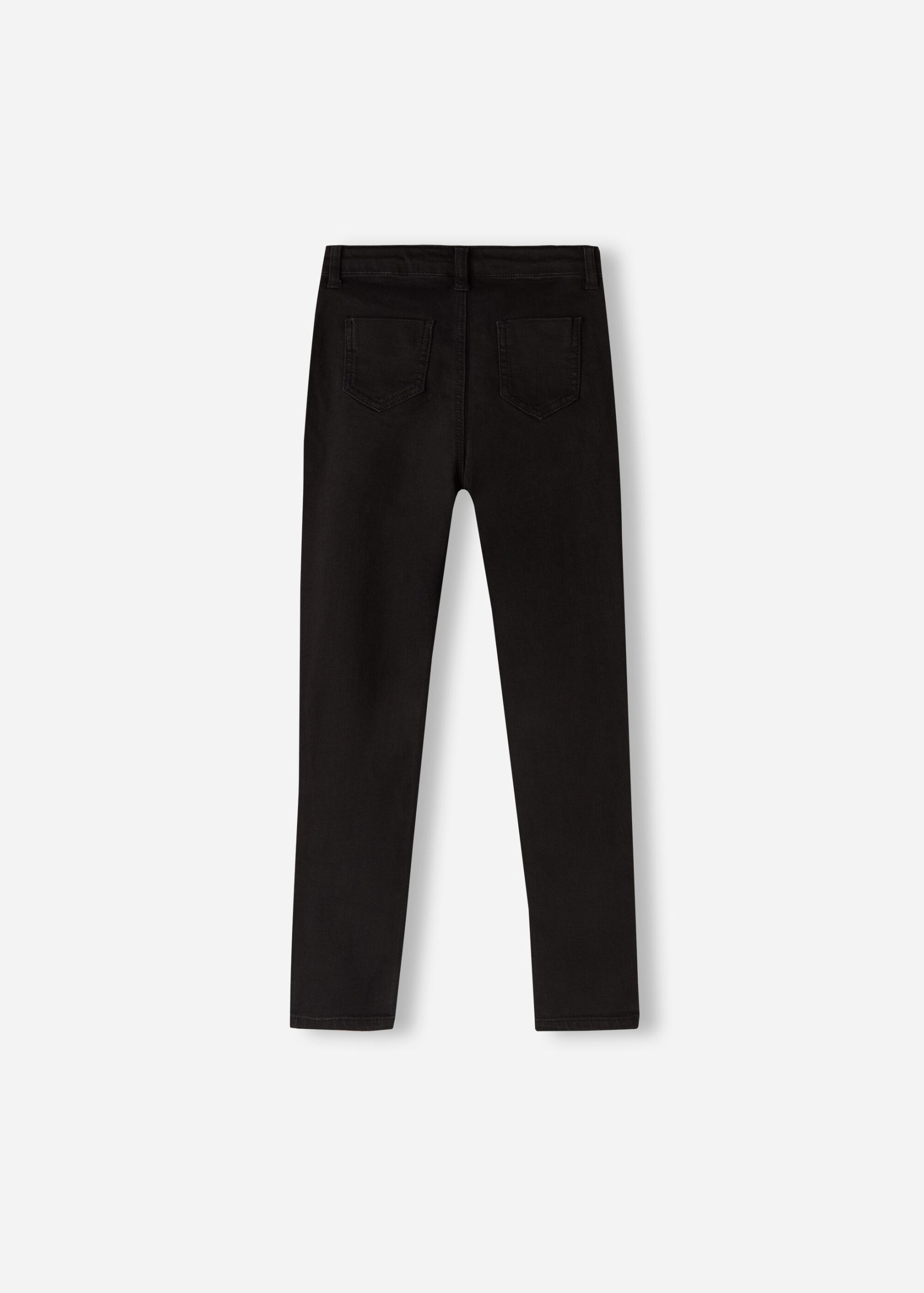 Girls’ skinny jeans in especially soft feel stretch denim with zip and button. Functional adjustable internal drawstring at waist. Faux front pockets and actual back pockets.