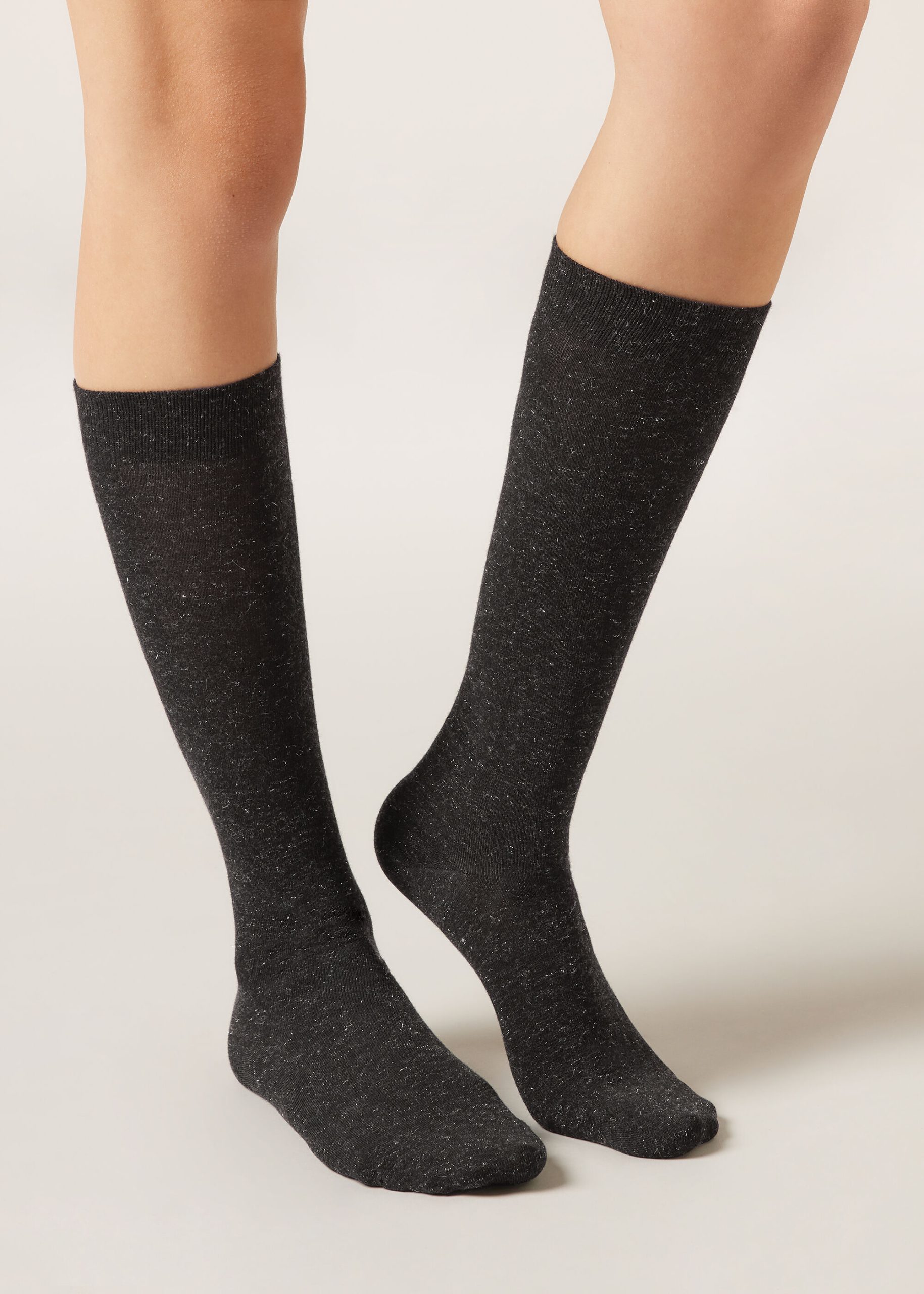 Women’s long socks with cashmere and glitter, ideal for glamorous elegance and unrivalled comfort. These socks offer a feeling of luxury and warmth, embellished with a touch of sparkle, ideal for facing the coldest days in style.