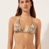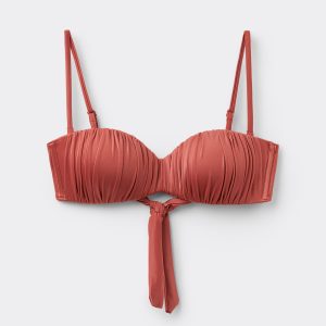 Bandeau bikini top with underwire, graduated padding cups, and side boning to guarantee good support, perfect for those with larger busts. The style features a bright fabric with a silky effect with ruffles. Adjustable and removable straps. Back tie closure.