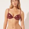 Bandeau bikini top with underwire, graduated padding cups, and side boning to guarantee good support, perfect for those with larger busts. The style features a bright fabric with a silky effect with ruffles. Adjustable and removable straps. Back tie closure.
