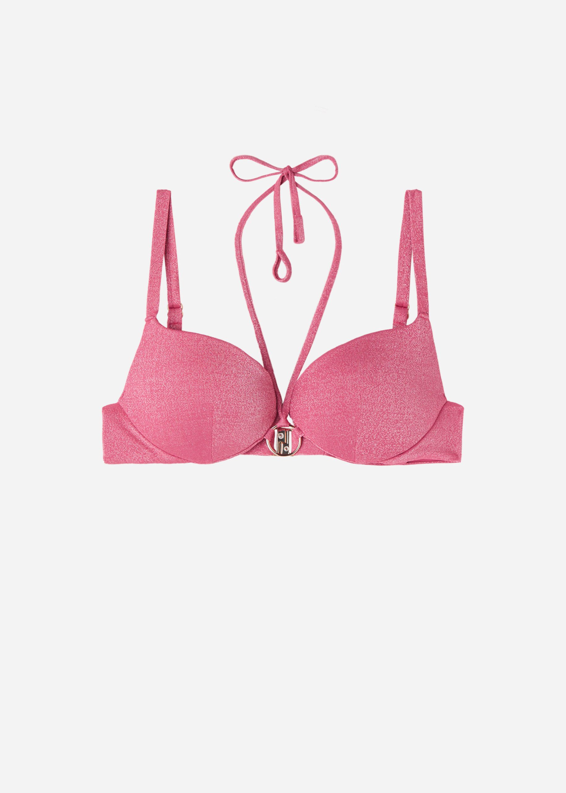 Push-up bikini top with graduated padding and underwire for more volume at the bust. Soft fabric with shiny lamé thread embellished with nickel free small gold rings. Adjustable straps and back hook closure.