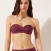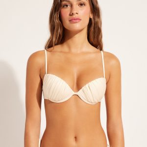 Push-up underwire bikini top with especially soft, graduated padded cups. The style features a bright fabric with a silky effect with ruffles. Adjustable straps and back tie closure.