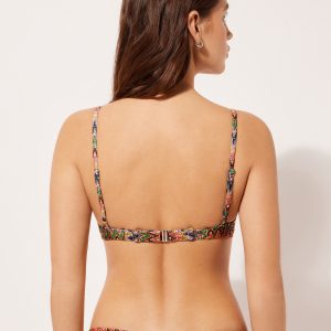 Push-up underwire bikini top with especially soft, graduated padded cups. The style features a bright fabric with a silky effect with ruffles. Adjustable straps and back tie closure.