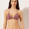 Wireless fixed triangle bikini top with graduated padded cups that add volume to enhance the décolleté. The style features a bright fabric with a silky effect, embellished by ruffles. The shoulder straps have eyelets on the ends so they can be hooked onto the back band or tied behind the neck. Back tie closure.