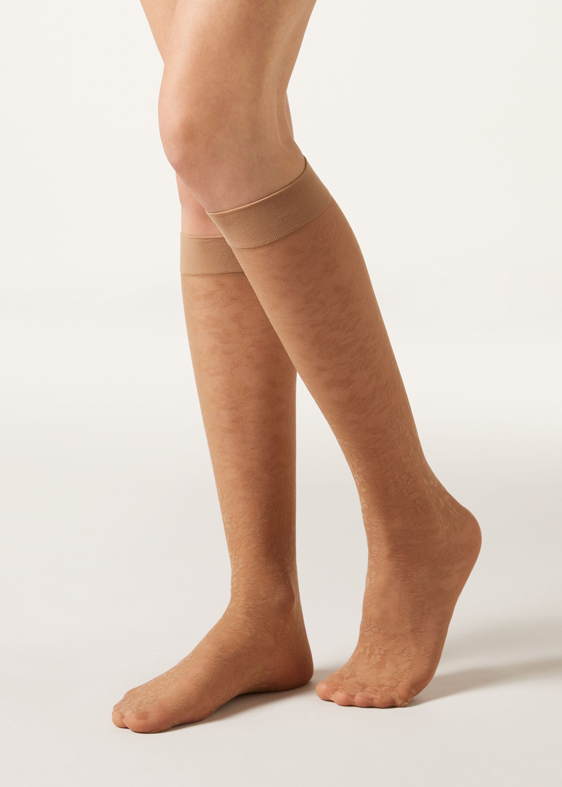Women’s knee-high socks in tulle 50 denier fabric embellished with a lace floral motif. Smooth cuff.