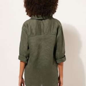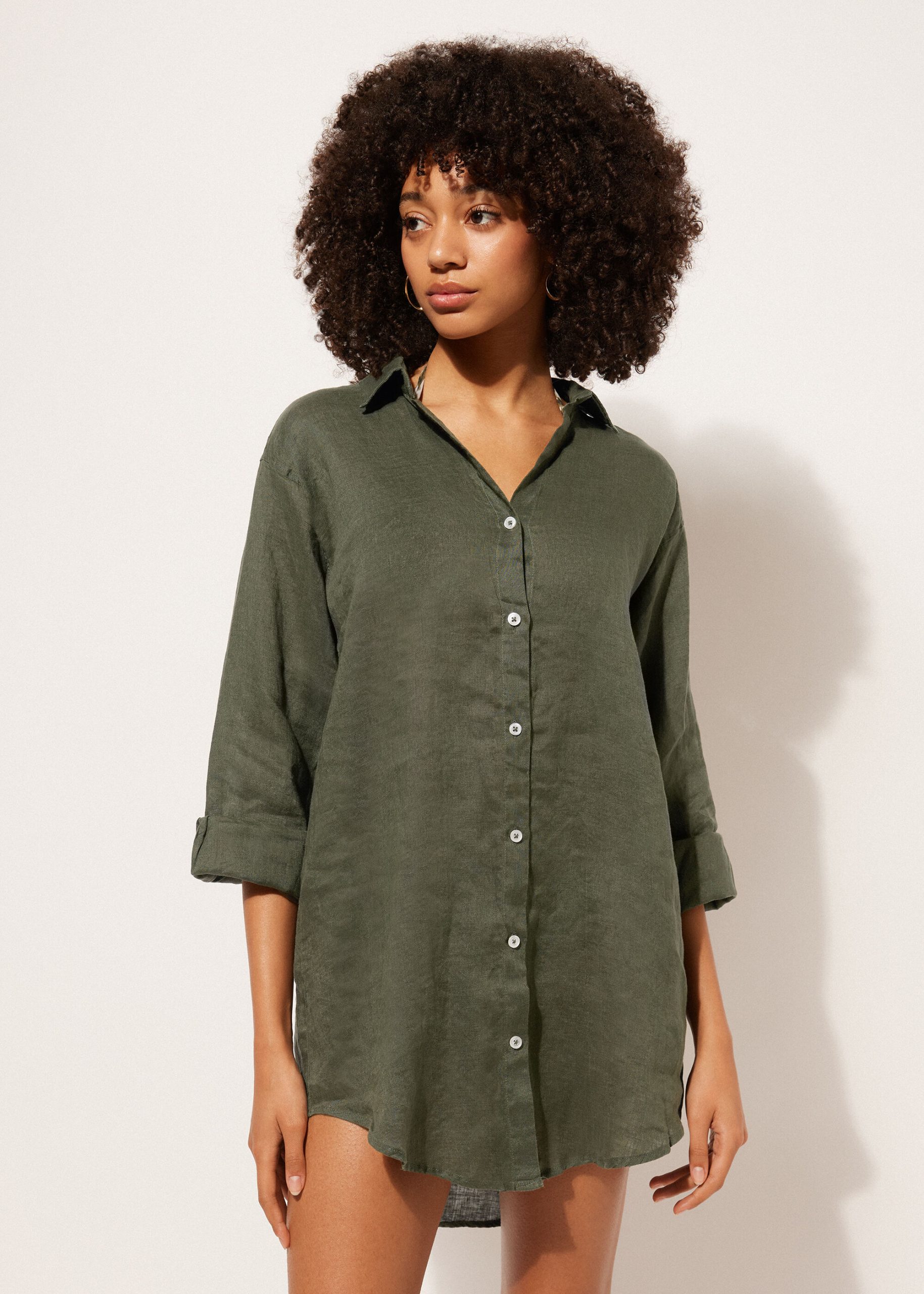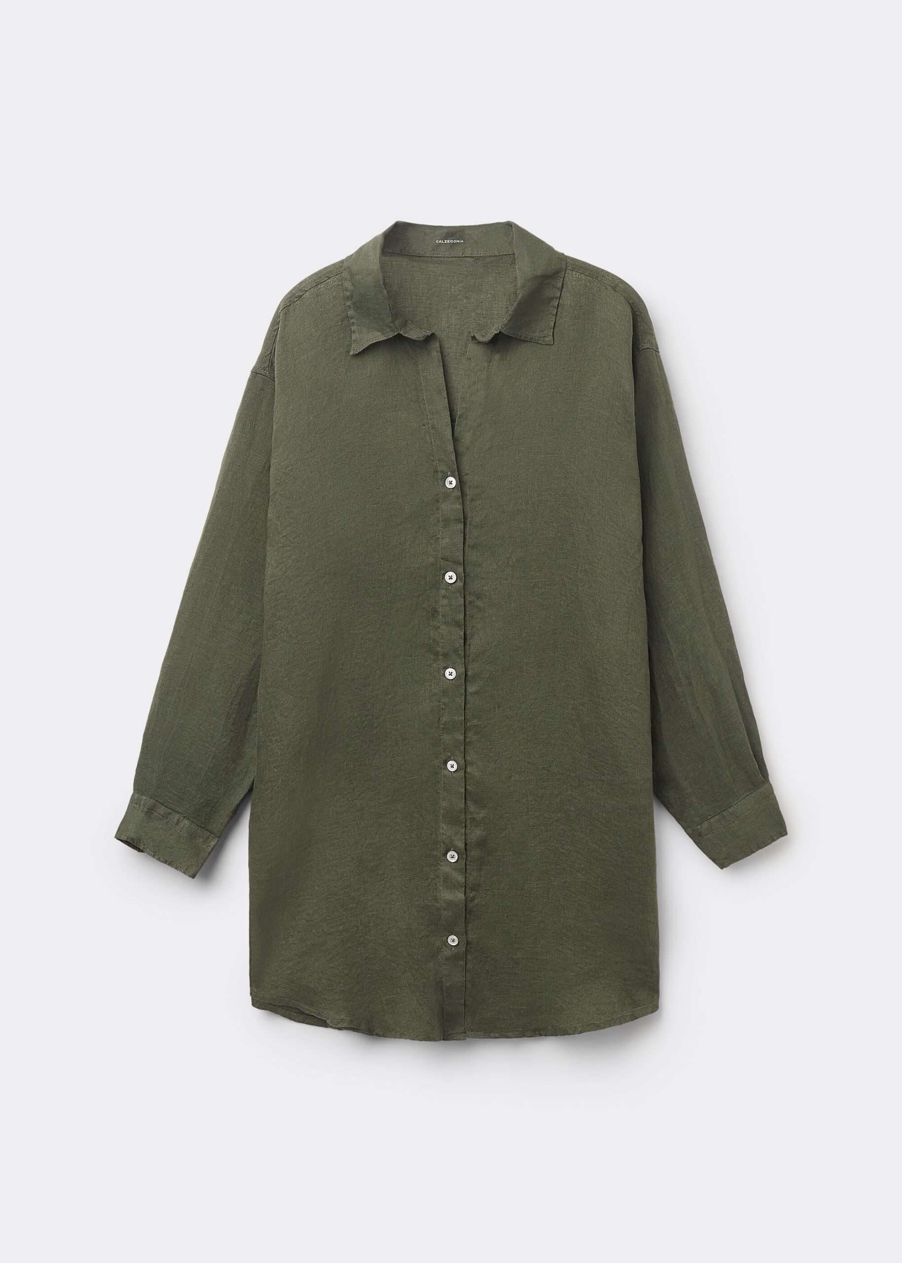 Button up shirtdress in linen for those who love natural fibers, with lapel collar and long sleeves. Above-the-knee length.