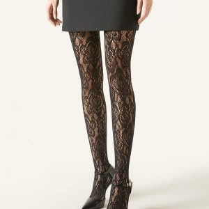 Women’s fishnet tights embellished with an opaque floral motif with a macramé lace effect.