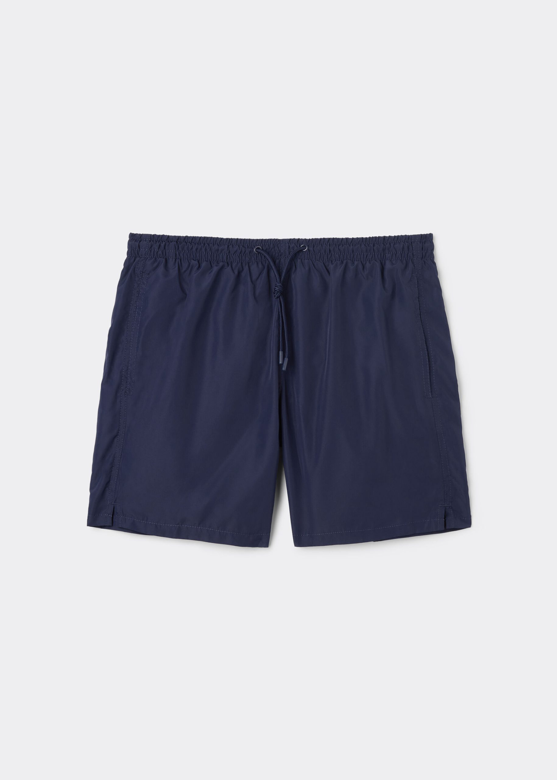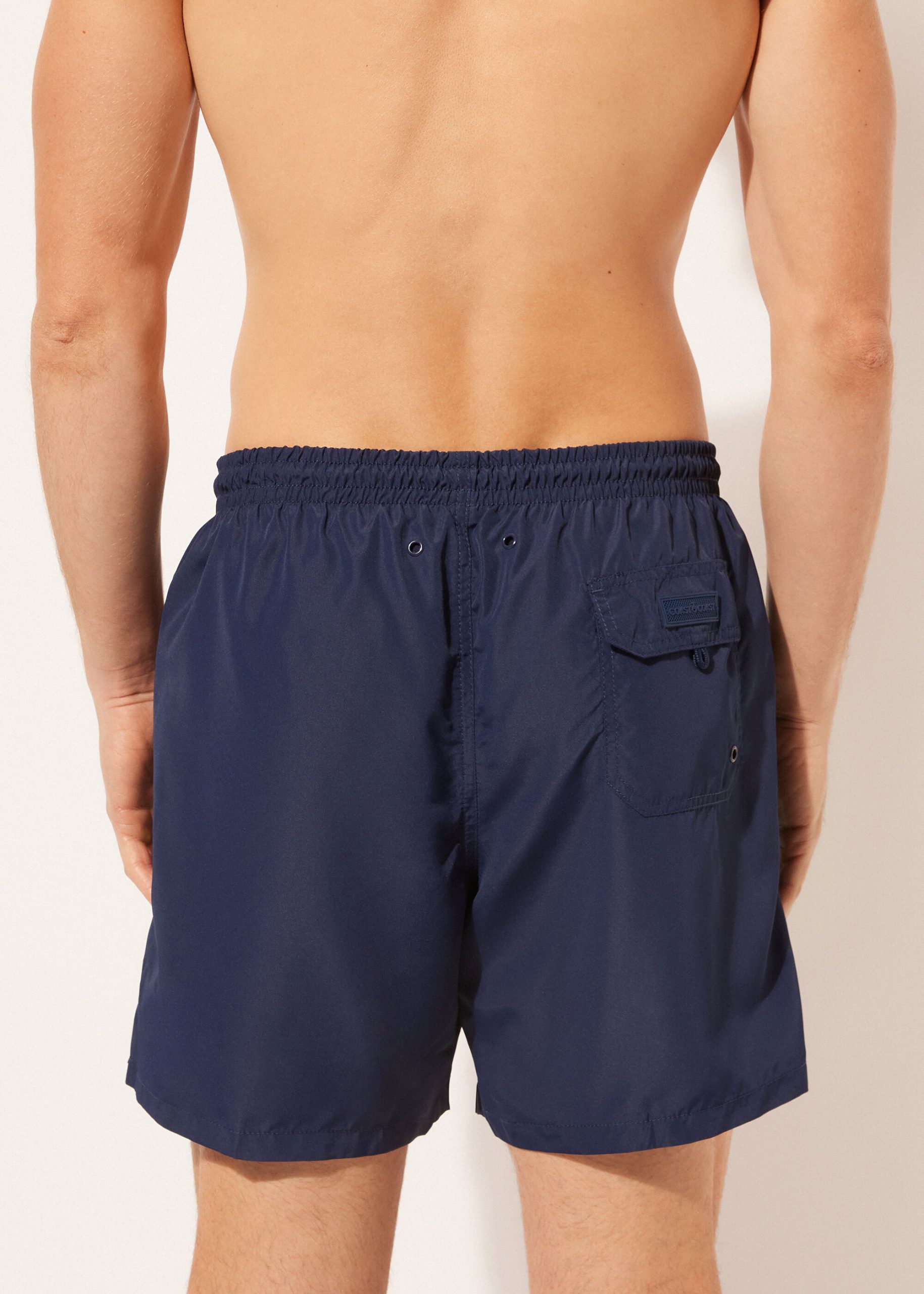 Men’s swim trunks with elastic at the waist. Drawstring with colored tip. Mid-thigh length with side welt pockets and internal mesh. Back patch pocket with logo. Quick-drying soft and comfy fabric.