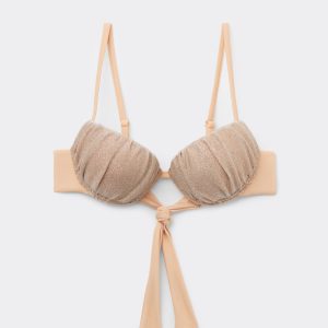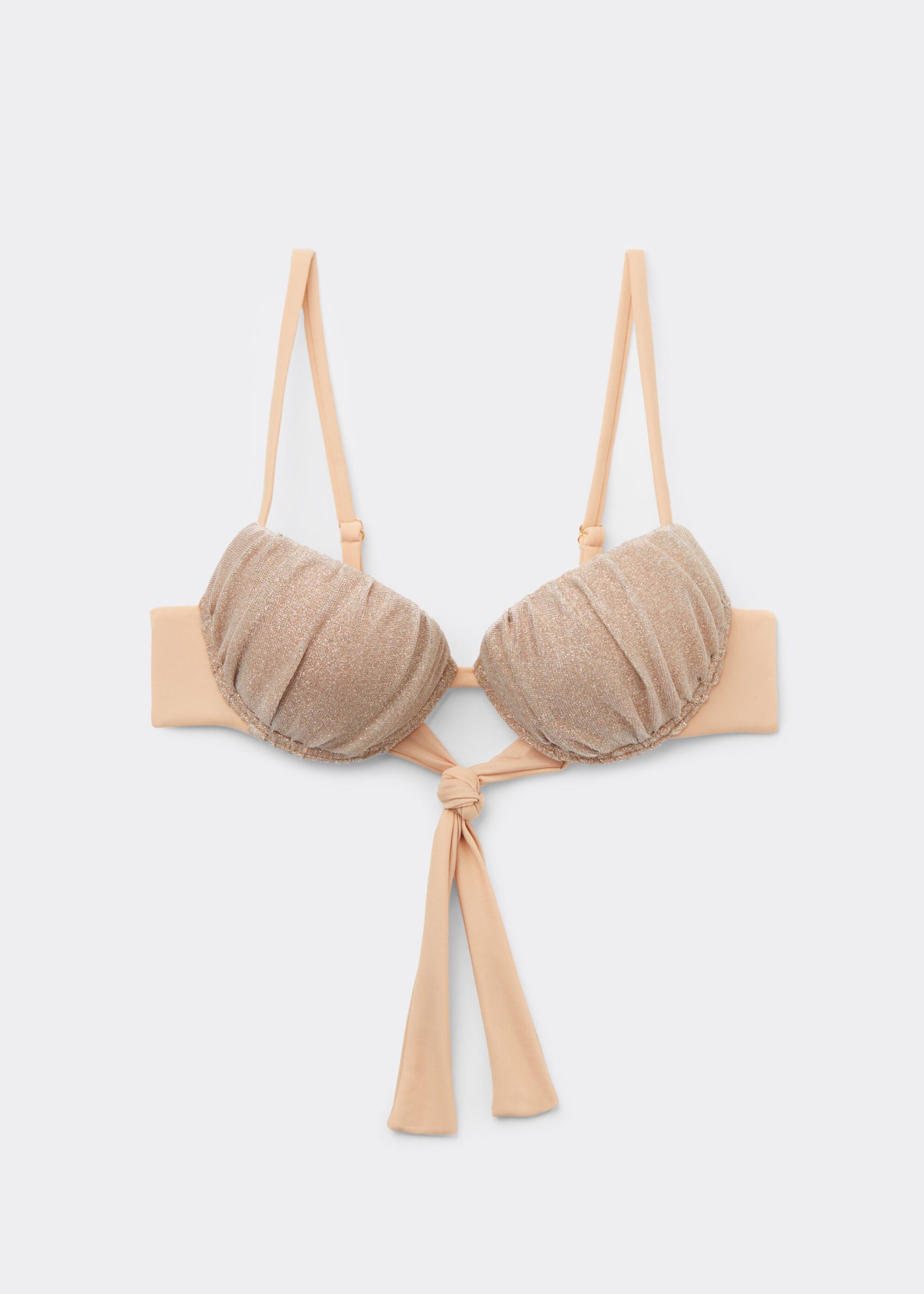 Push-up underwire bikini top with especially soft, graduated padded cups. The bright glittery fabric stands out with its sophisticated shine, not only perfect for a glamorous look on the beach but also for being paired with matching pieces. Adjustable straps and back tie closure.