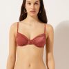 Wireless fixed triangle bikini top with graduated padded cups that add volume to enhance the décolleté. The style features a crinkle fabric embellished with contrast color embroidery. The shoulder straps have eyelets on the ends so they can be hooked onto the back band or tied behind the neck. Back tie closure.