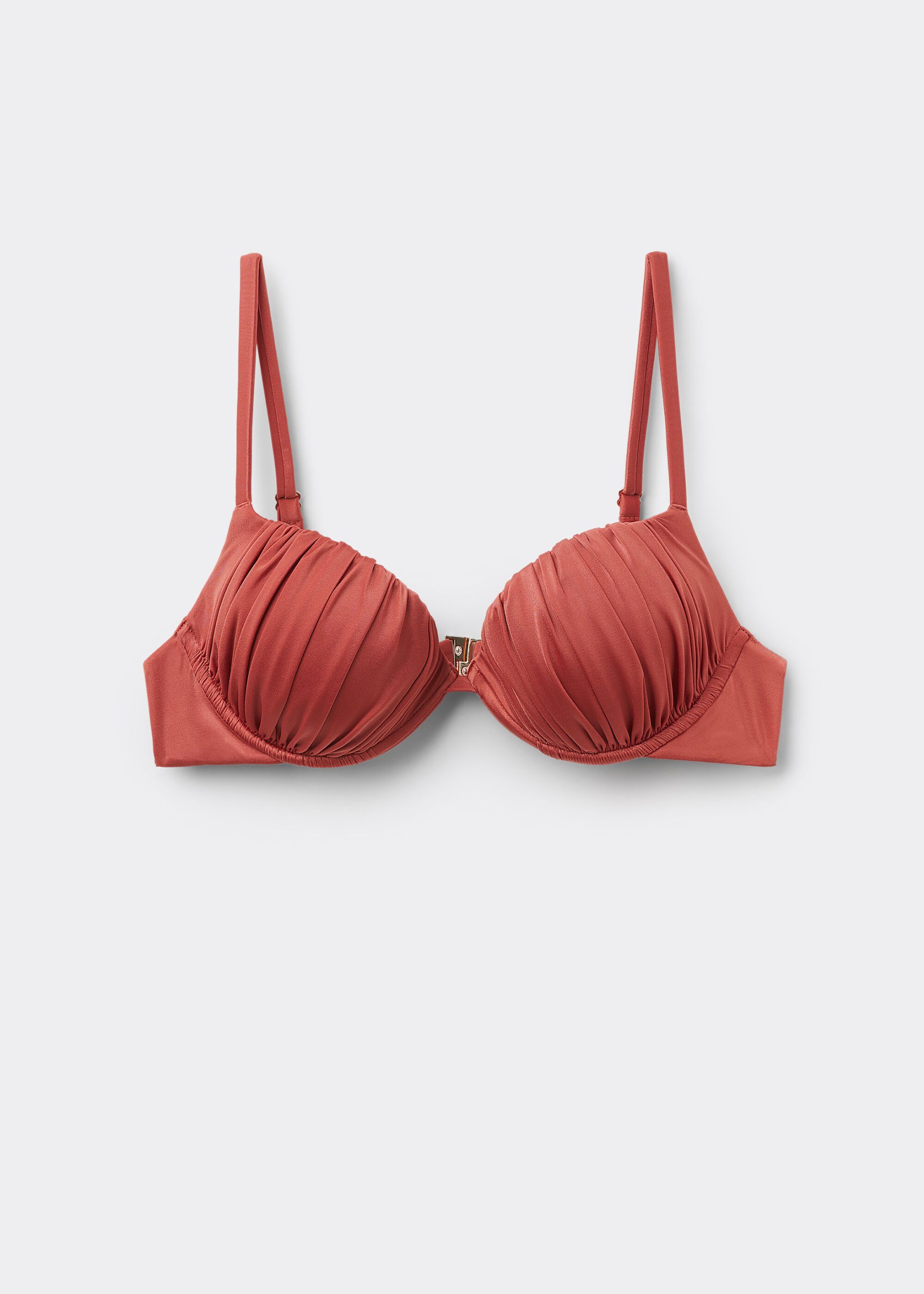 Push-up bikini top with lightly padded cups and underwire to guarantee support and provide volume. The style features a bright fabric with a silky effect. Fixed Shoulder Straps. Rear closure with double adjustment hook.