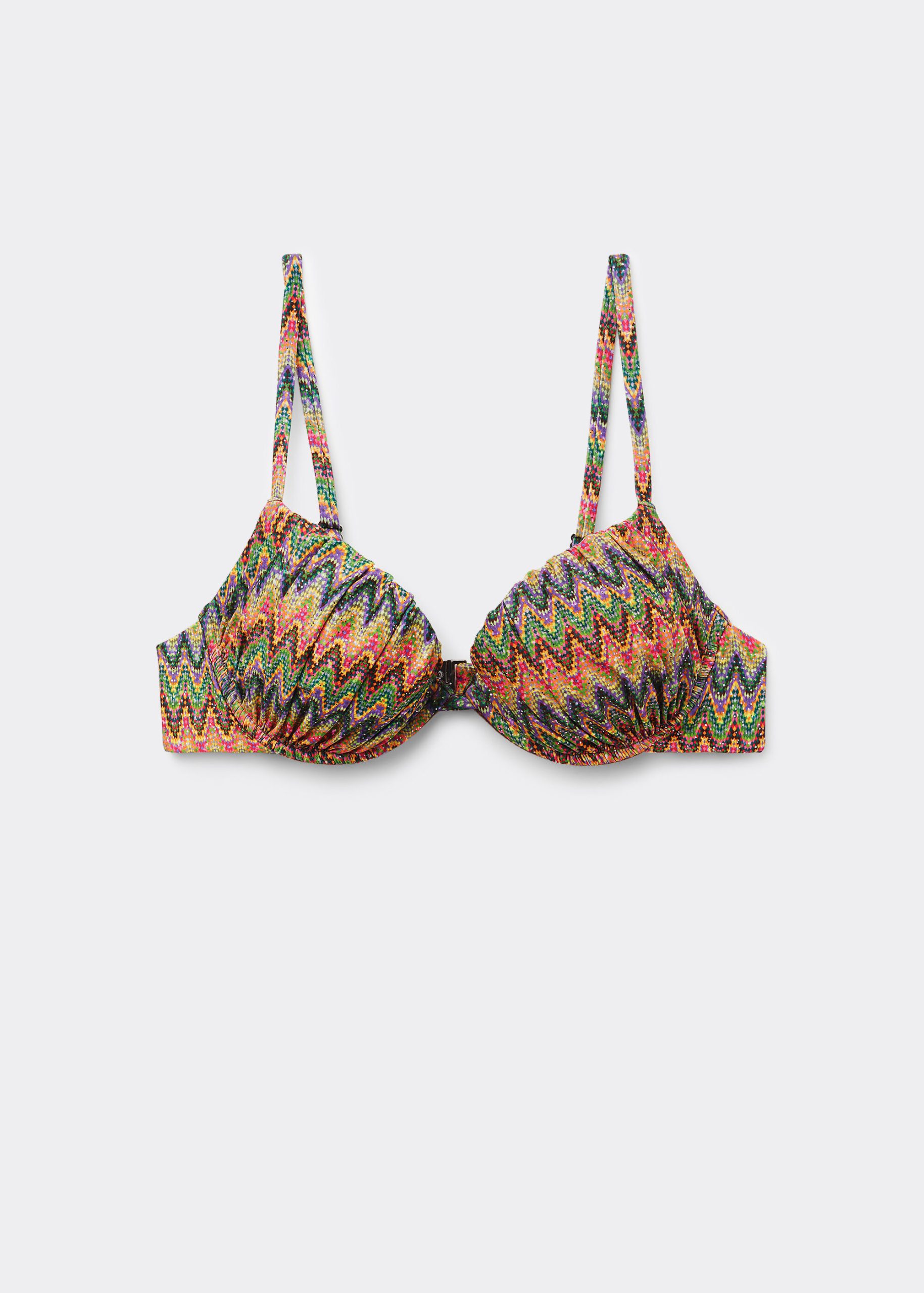 Push-up bikini top with lightly padded cups and underwire to guarantee support and provide volume. The multicolored pattern, featuring a wave motif and a bold mix of bright colors, has a dynamic effect ideal for the summer. Fixed Shoulder Straps. Back closure with two sets of hooks to improve the fit of the underband.