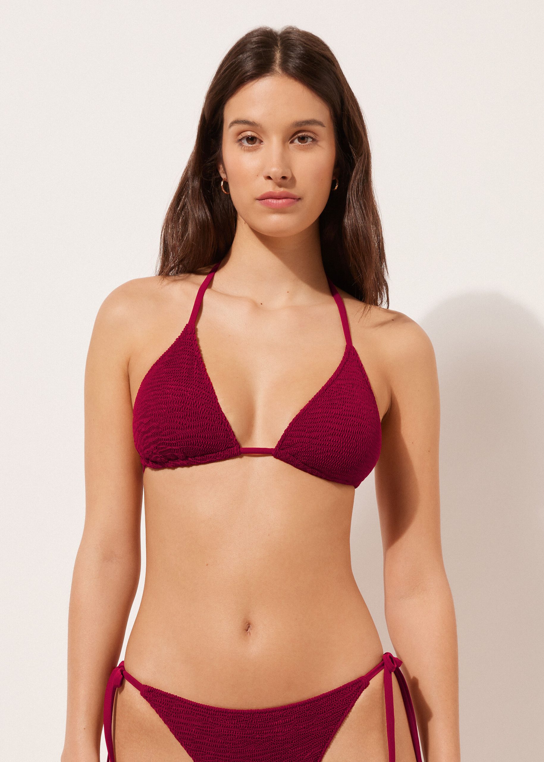 Slide triangle bikini top with removable cups and no underwire for a natural effect. The style features a crinkle fabric with a three-dimensional effect. The shoulder straps have eyelets on the ends so they can be hooked onto the back band or tied behind the neck. Back string tie closure.