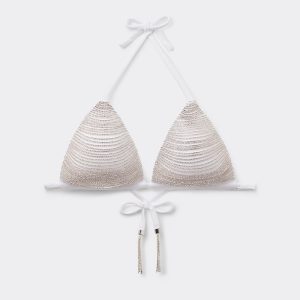 Wireless triangle bikini top with light internal padding. The shoulder straps with buttonholes can be inserted into the band or fastened behind the neck. Fastens with a string tie in back. Shine in style in this exclusive top, embellished with gemstone threads. The perfect top to pair with your glamorous evening outfits. PLEASE NOTE: this garment has been hand embellished. Each garment is unique. Due to the delicate nature of this garment, please take care when washing.
