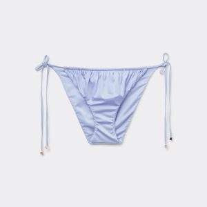 Bikini bottom with side ties to adjust the fit. The style features a bright fabric with a silky effect, embellished by ruffles and gold tips. Fully lined with invisible seams.