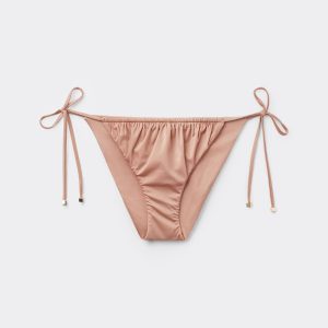 Bikini bottom with side ties to adjust the fit. The style features a bright fabric with a silky effect, embellished by ruffles and gold tips. Fully lined with invisible seams.