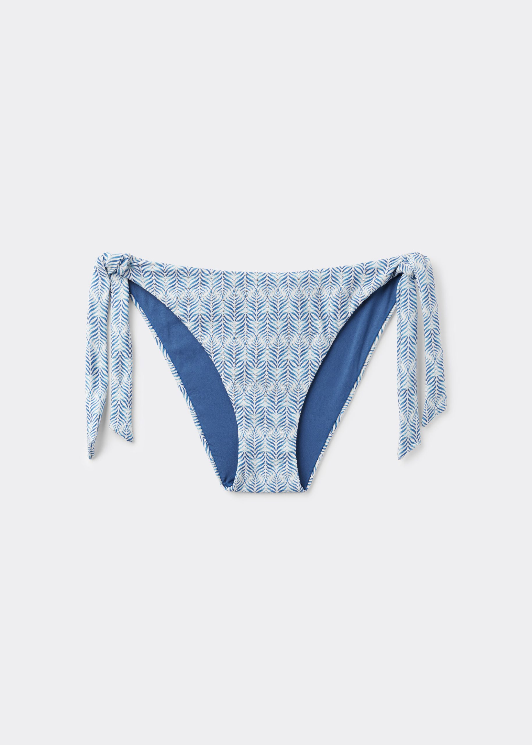Bikini bottoms with side tie closure to adjust the fit. A refined geometric pattern in delicate shades of white and blue, embellished by micro-beads that add a touch of elegance and sophistication. The slightly rounded waist allows it to be worn either as normal or with the legs higher to show off the physique. Fully lined with invisible seams.