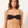 Thong bikini bottoms with side string ties to adjust the fit. It features a minimal fit that exalts the silhouette with a touch of sensuality and refinement. The slightly rounded waist at the front allows for both a regular and more high-cut fit, depending on one’s physique. The bright silk-effect fabric embellished by elegant golden details radiates a sophisticated sensation of discrete luxury. Fully lined with invisible seams.