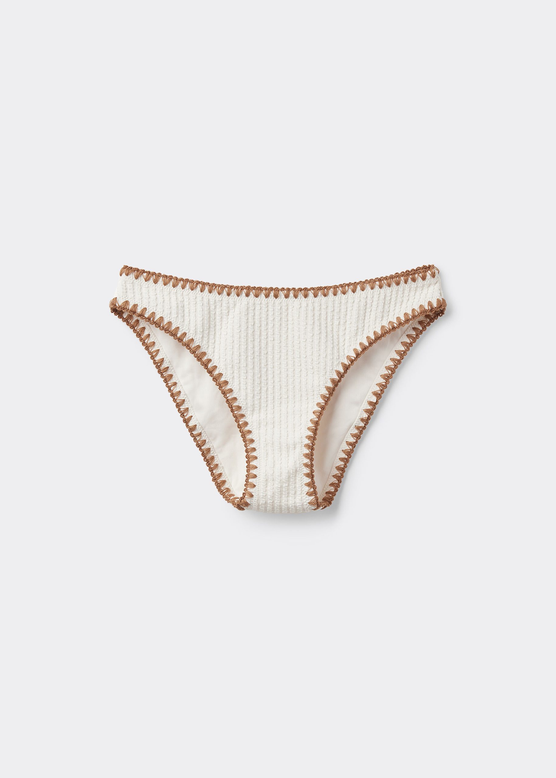 Fully lined bikini bottom with invisible seams in crinkle fabric embellished with contrast color embroidery. The slightly rounded waist at the front allows for both a classic or more high-cut fit, depending on one’s physique.