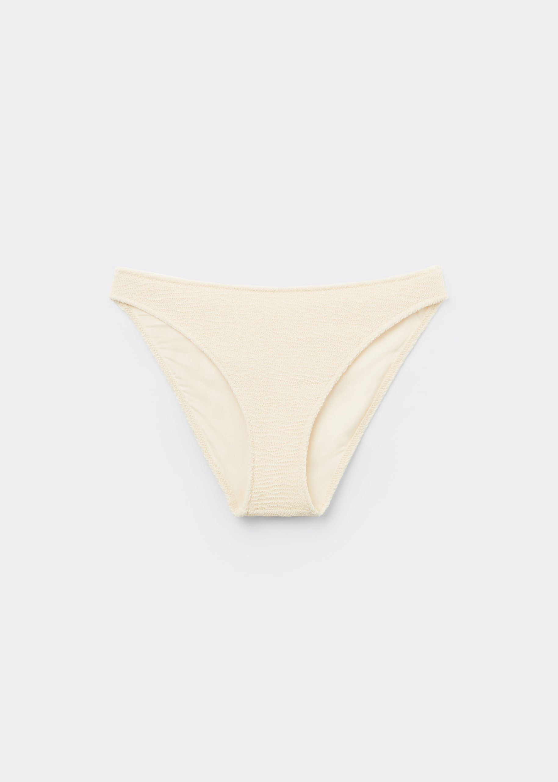 Fully lined bikini bottoms with invisible seams in a crinkle fabric with a three-dimensional effect. The slightly rounded waist allows it to be worn either as normal or with the legs higher to show off the physique.