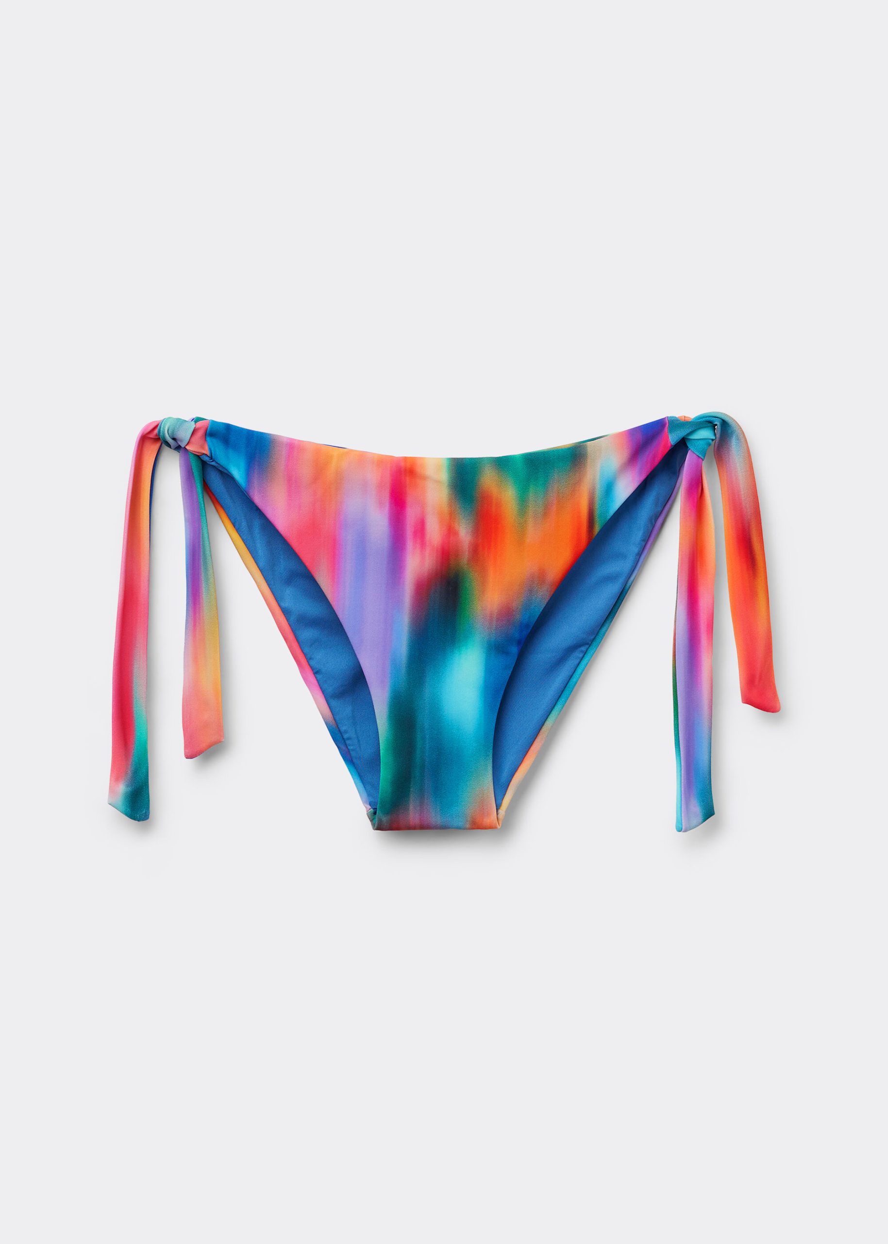Bikini bottoms with side tie closure to adjust the fit. A colorful fabric full of bold and bright rainbow shades that blend fluidly for a dynamic and luminous effect. The slightly rounded waist allows it to be worn either as normal or with the legs higher to show off the physique. Fully lined with invisible seams.