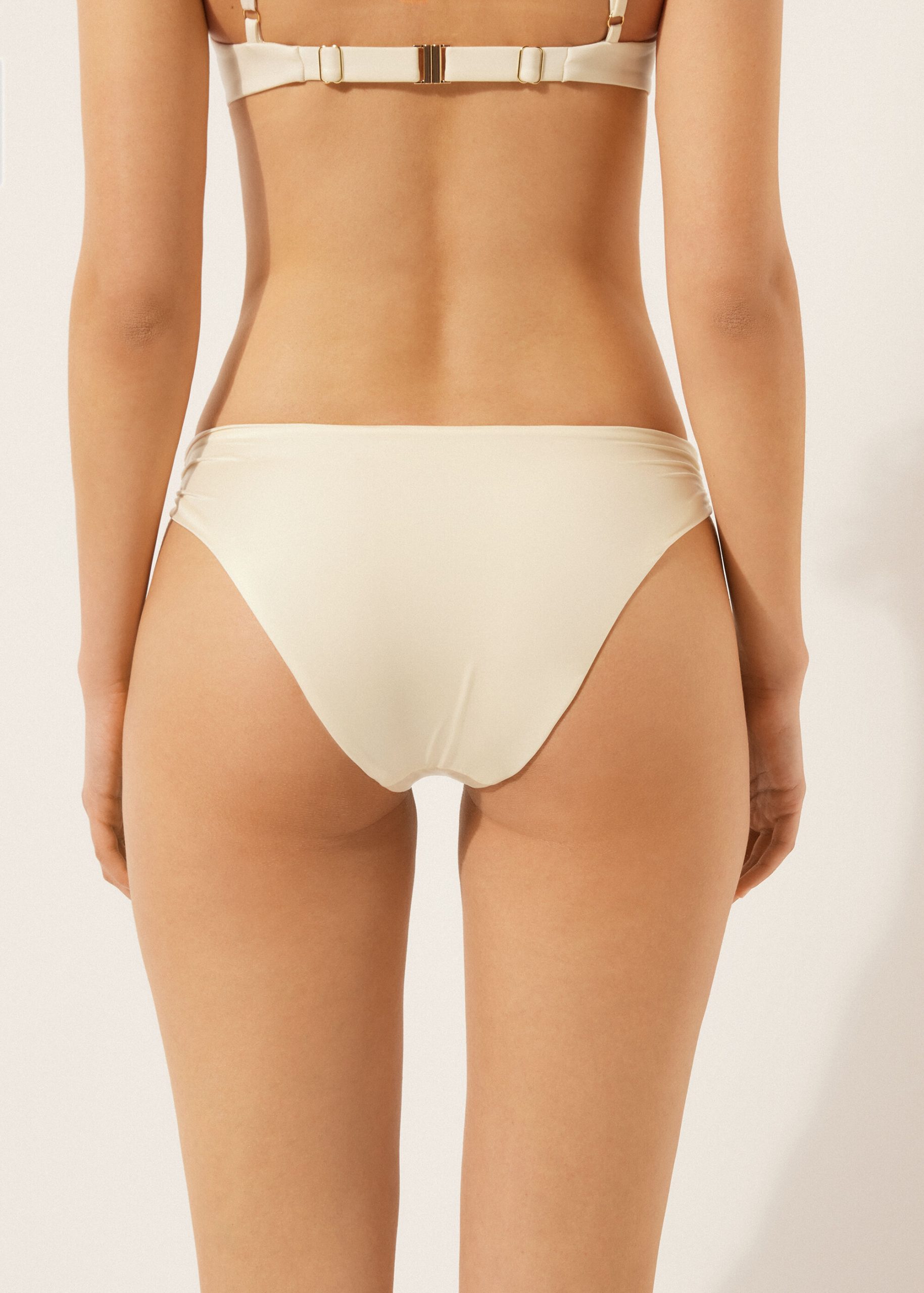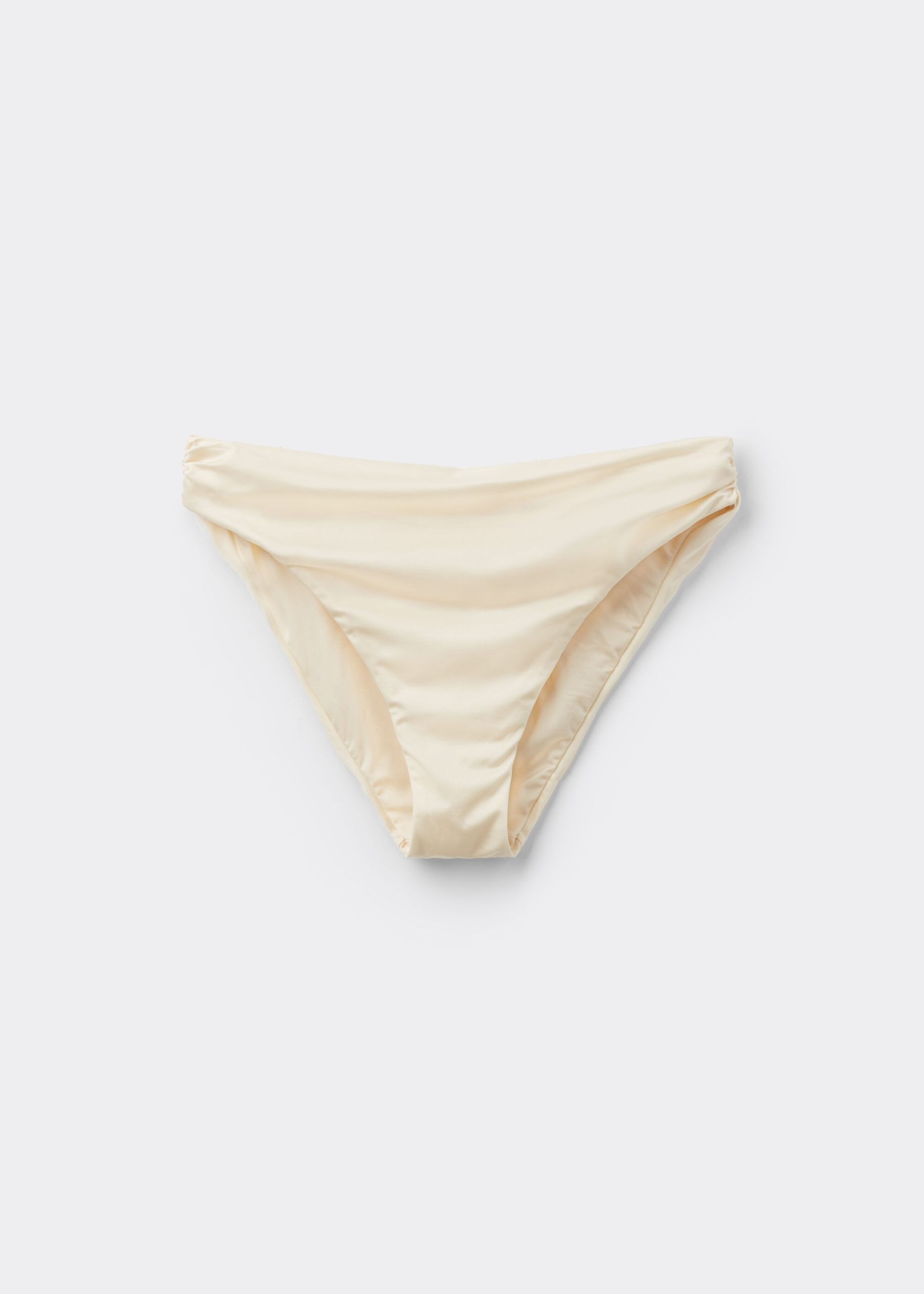 Fully lined bikini bottoms with invisible seams. The style features a bright fabric with a silky effect. The slightly rounded waist at the front allows for both a classic or more high-cut fit, depending on one’s physique.