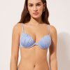 Wireless single strap bikini top with light padding that softly shapes the bust. The 3D crinkled fabric, enriched by a braided string, provides a touch of sophisticated elegance. The side boning ensures excellent support, while the string tie fastening at the back completes the design for this distinctive, modern and feminine summer look.