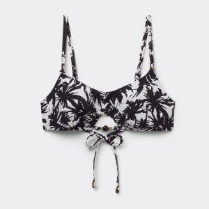 Wireless tank-style bikini top with lightly padded cups. The side boning helps support the bust. The style features an opening at the center of the bust embellished with small two-tone pearls. White and black palm tree print. Adjustable shoulder straps and thin tie closure on the back embellished with small golden pearls.