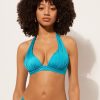 Wireless tank-style bikini top with lightly padded cups. The side boning helps support the bust. The style features an opening at the center of the bust embellished with two small nickel free rings. Three-dimensional especially soft fabric with diagonal motif. Adjustable shoulder straps and thin tie closure on the back embellished with golden tips.