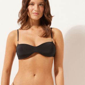 Tank style bikini top, wireless and unpadded for a natural effect. It features a minimal fit that exalts the silhouette with a touch of sensuality and refinement. The bright silk-effect fabric embellished by elegant golden details radiates a sophisticated sensation of discrete luxury. Adjustable shoulder straps and string tie fastening complete the design for this summer look that does not pass by unnoticed.