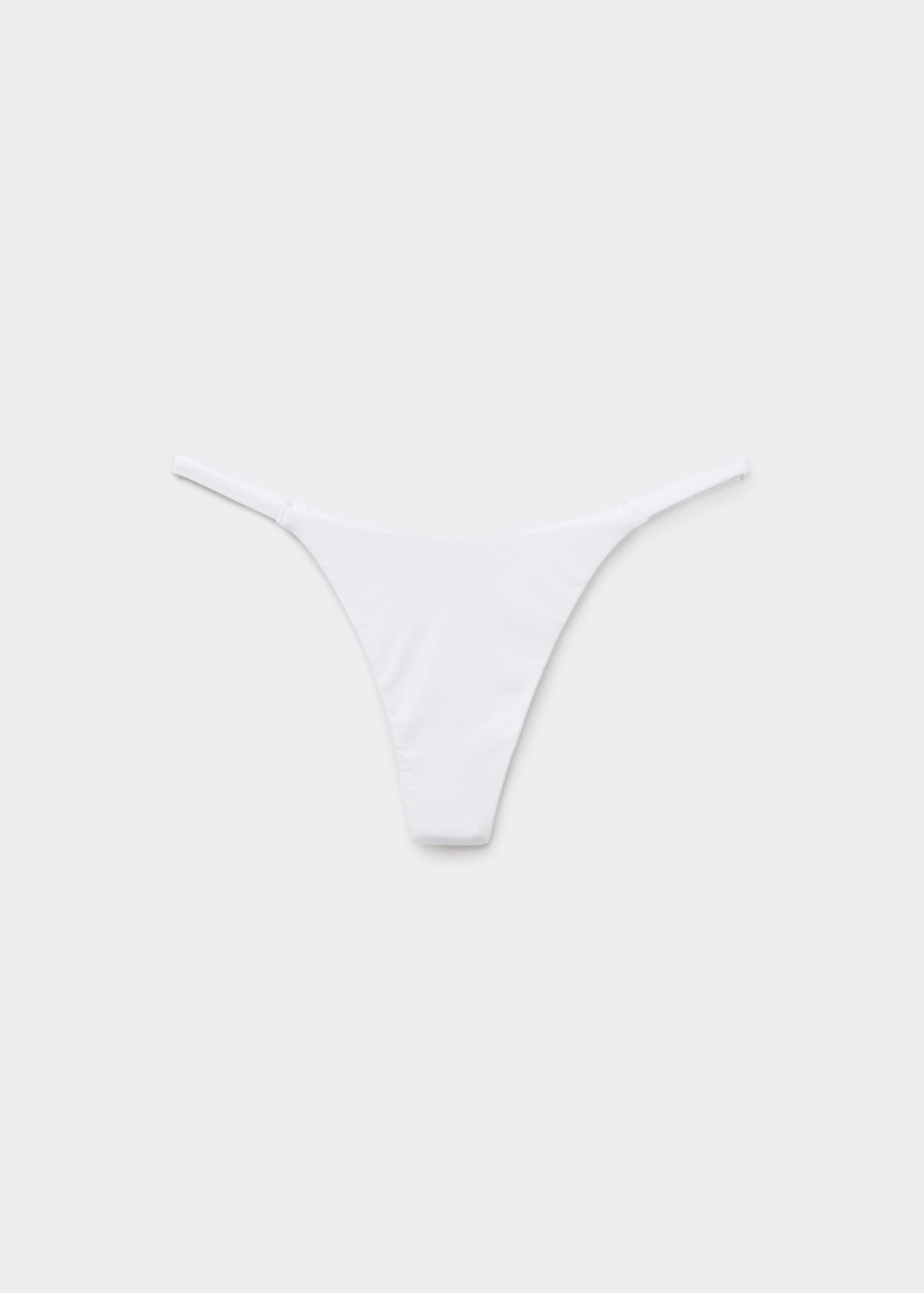 Thong bikini bottom with adjustable thin sides. The slightly rounded front allows for wearing it either as normal or with the legs higher on the sides to show off the physique. The extremely soft fabric makes it pleasant to wear, offering a light and comfortable feel on the skin. Fully lined with invisible seams.