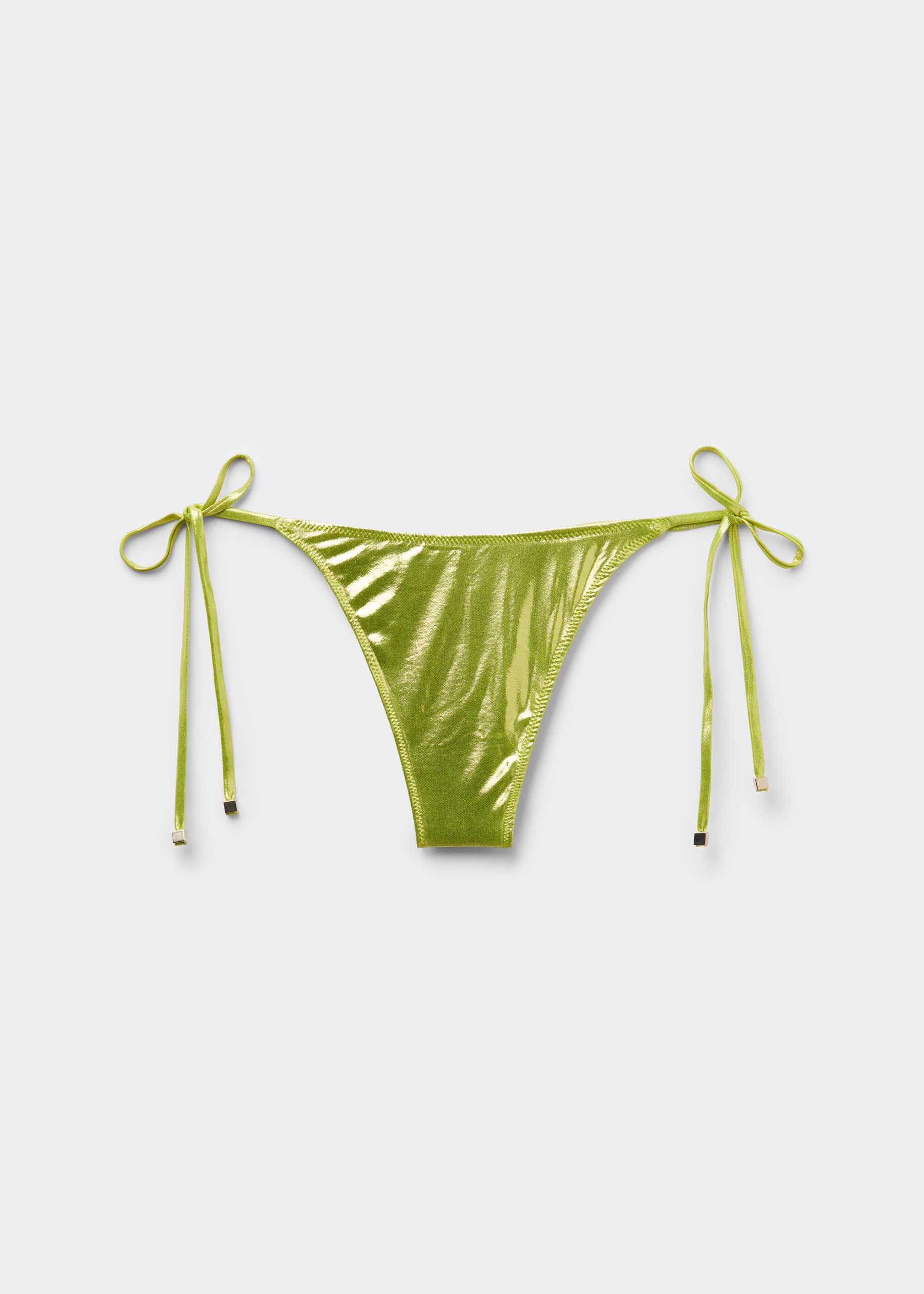 Thong bikini bottoms with adjustable thin sides. The slightly rounded front allows for wearing it either as normal or with the legs higher on the sides to show off the physique. The style features an extra shiny, metallic effect fabric. Fully lined with invisible seams.