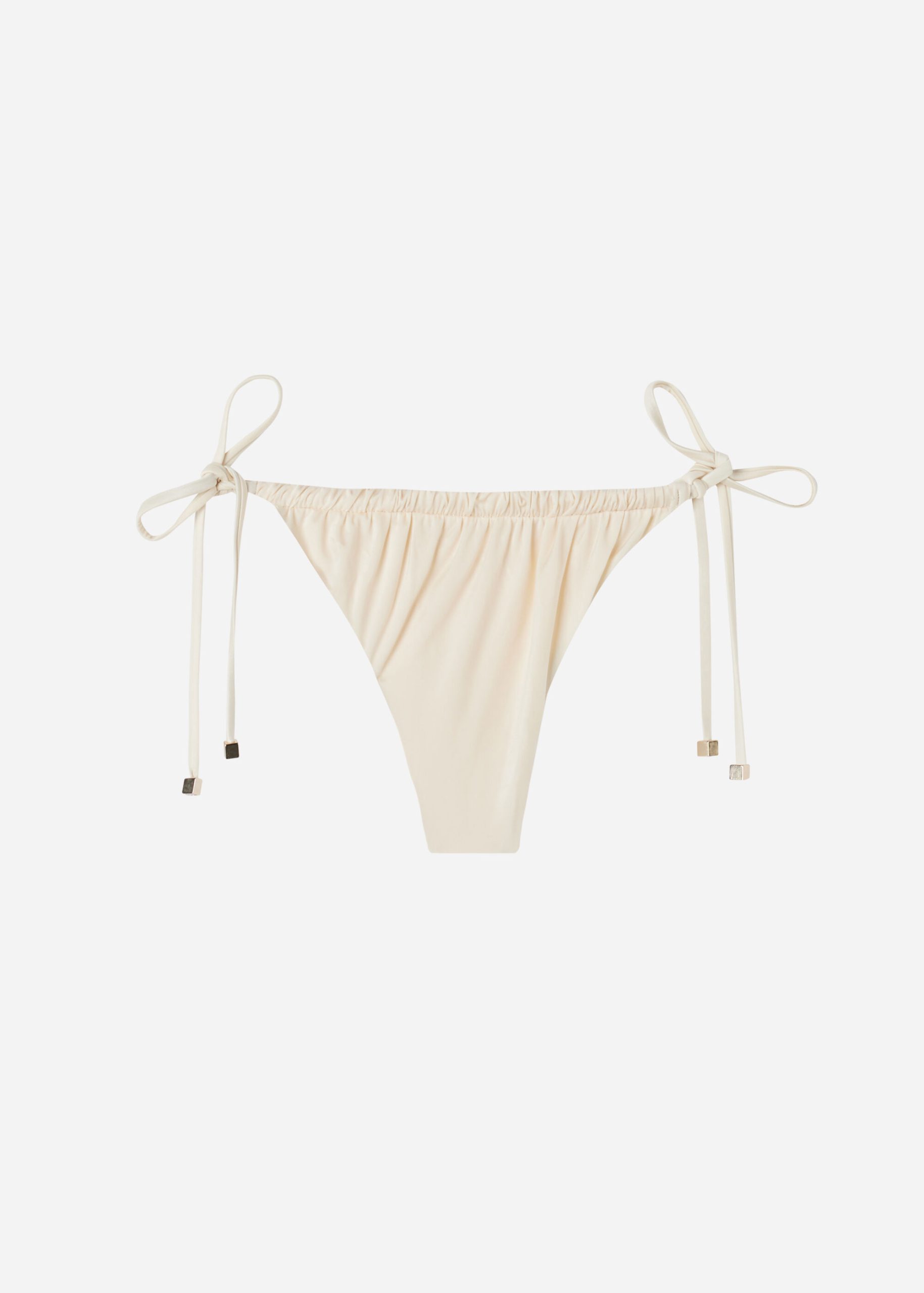 Thong bikini bottoms with adjustable thin sides. The slightly rounded front allows for wearing it either as normal or with the legs higher on the sides to show off the physique. Fully lined with invisible seams.