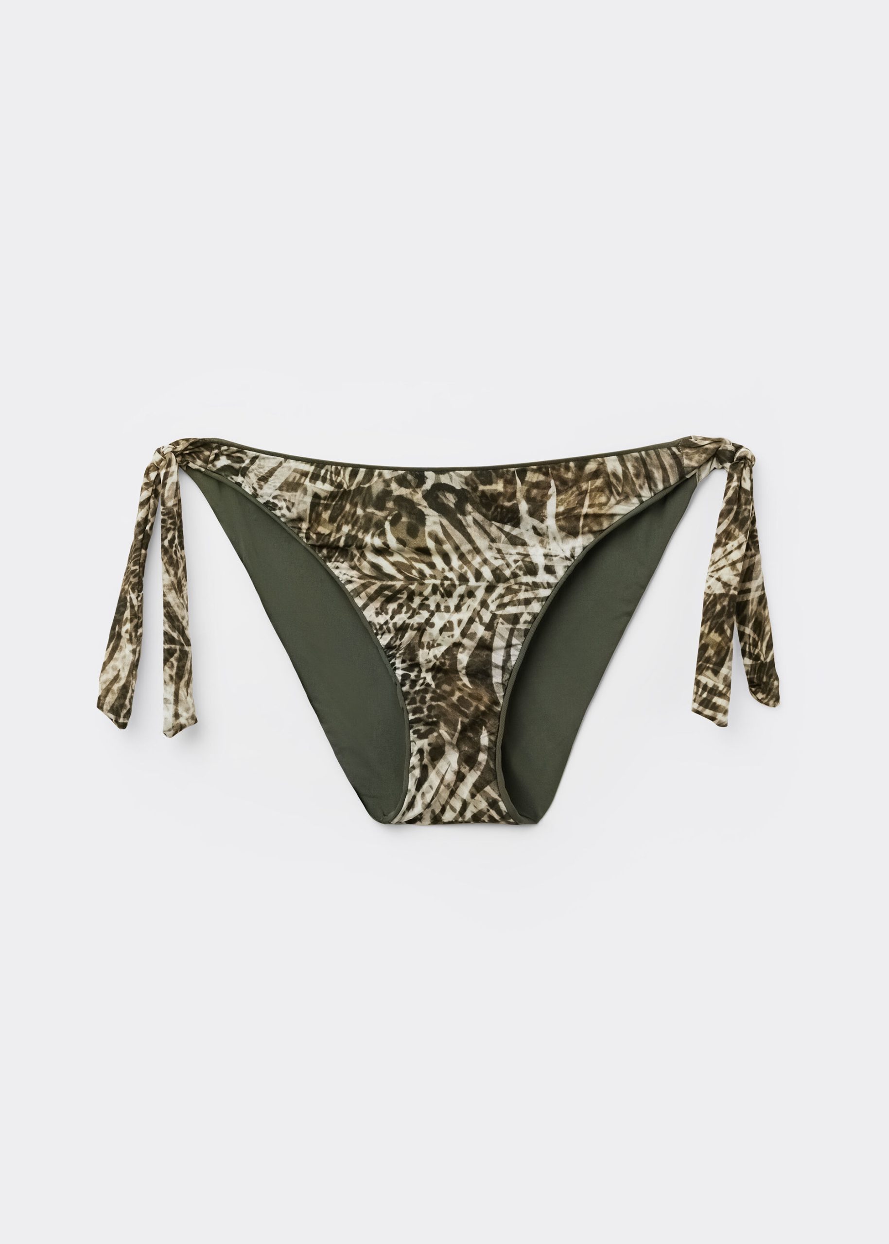 Bikini bottoms with side tie closure to adjust the fit. Reminiscent of animal print, the foliage pattern brings together exotic leaf designs with motifs that evoke markings from the animal world. The slightly rounded waist allows it to be worn either as normal or with the legs higher to show off the physique. Fully lined with invisible seams.
