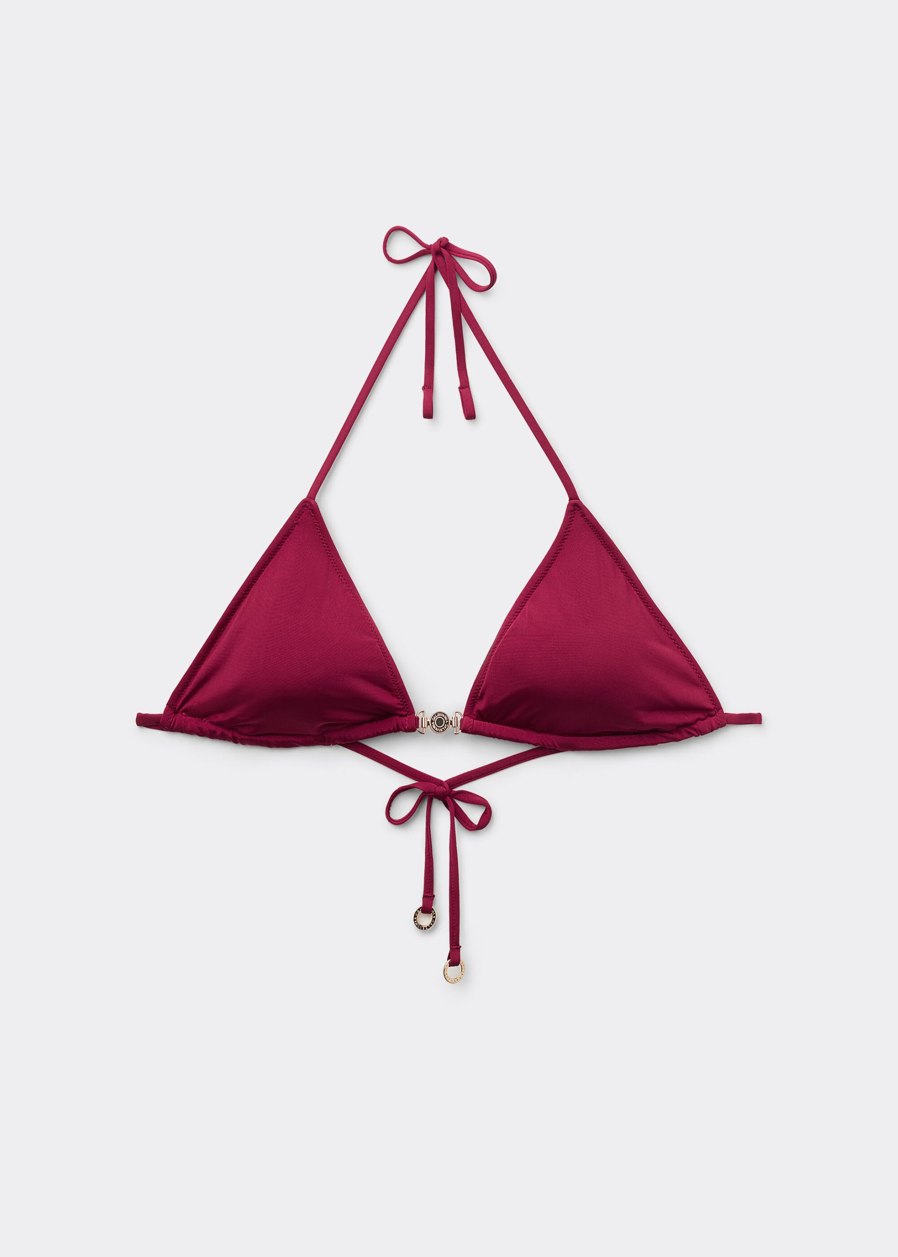 Slide triangle style bikini top with removable padding, wireless, featuring a minimal fit that exalts the silhouette with a touch of sensuality and refinement. The bright silk-effect fabric embellished by elegant golden details radiates a sophisticated sensation of discrete luxury. The straps have an eyelet at the end to insert them on the underband or fasten behind the neck, while the string tie fastening on the back guarantees an adjustable fit. Perfect for a sophisticated and irresistible summer look.