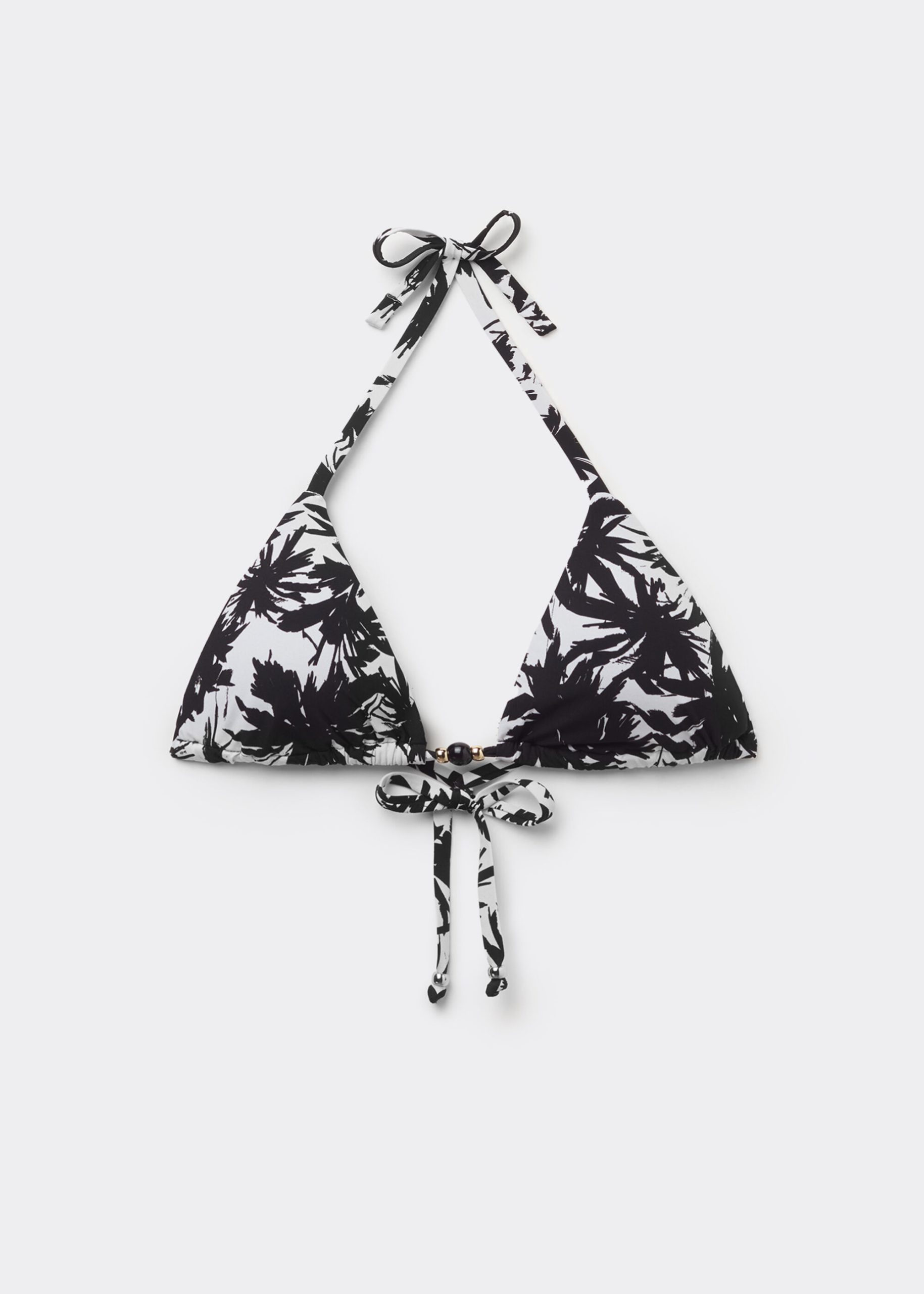 Slide triangle bikini top with removable padding, wireless for a natural effect. The style features a black and white palm tree patterned fabric with small two-tone pearl embellishments. The shoulder straps have eyelets on the ends so they can be hooked onto the back band or tied behind the neck. Back string tie closure.