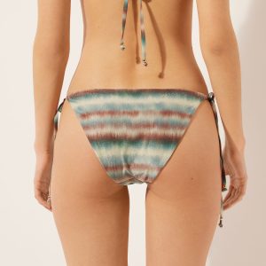 Bikini bottoms with thin side ties. The slightly rounded waist at the front allows for both a classic or more high-cut fit, depending on one’s physique. Made of soft microfiber with a refined foliage pattern. Fully lined with invisible seams.